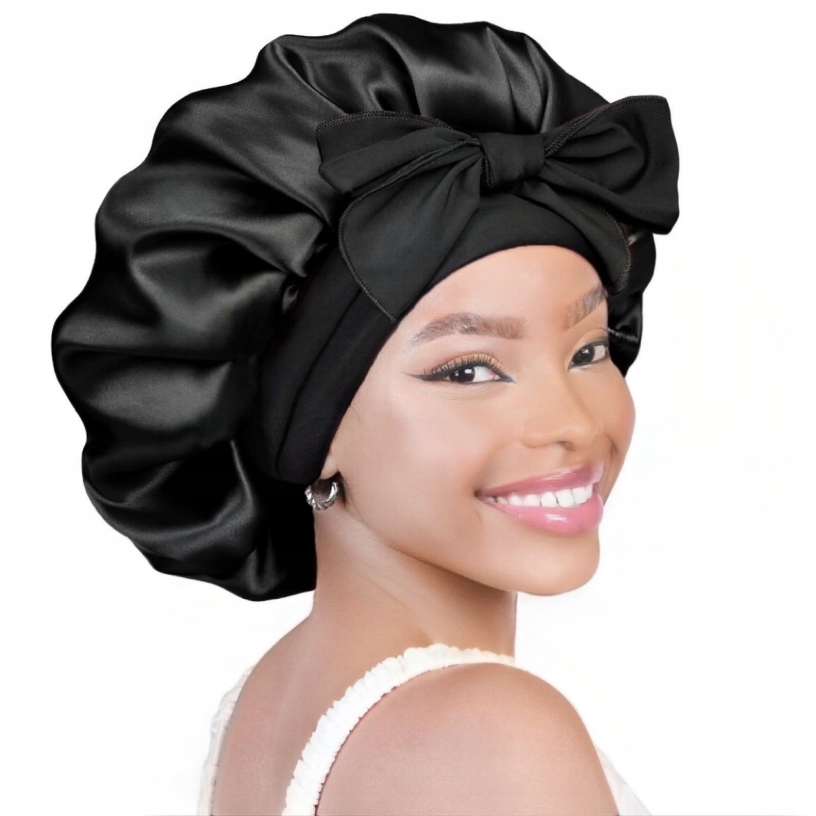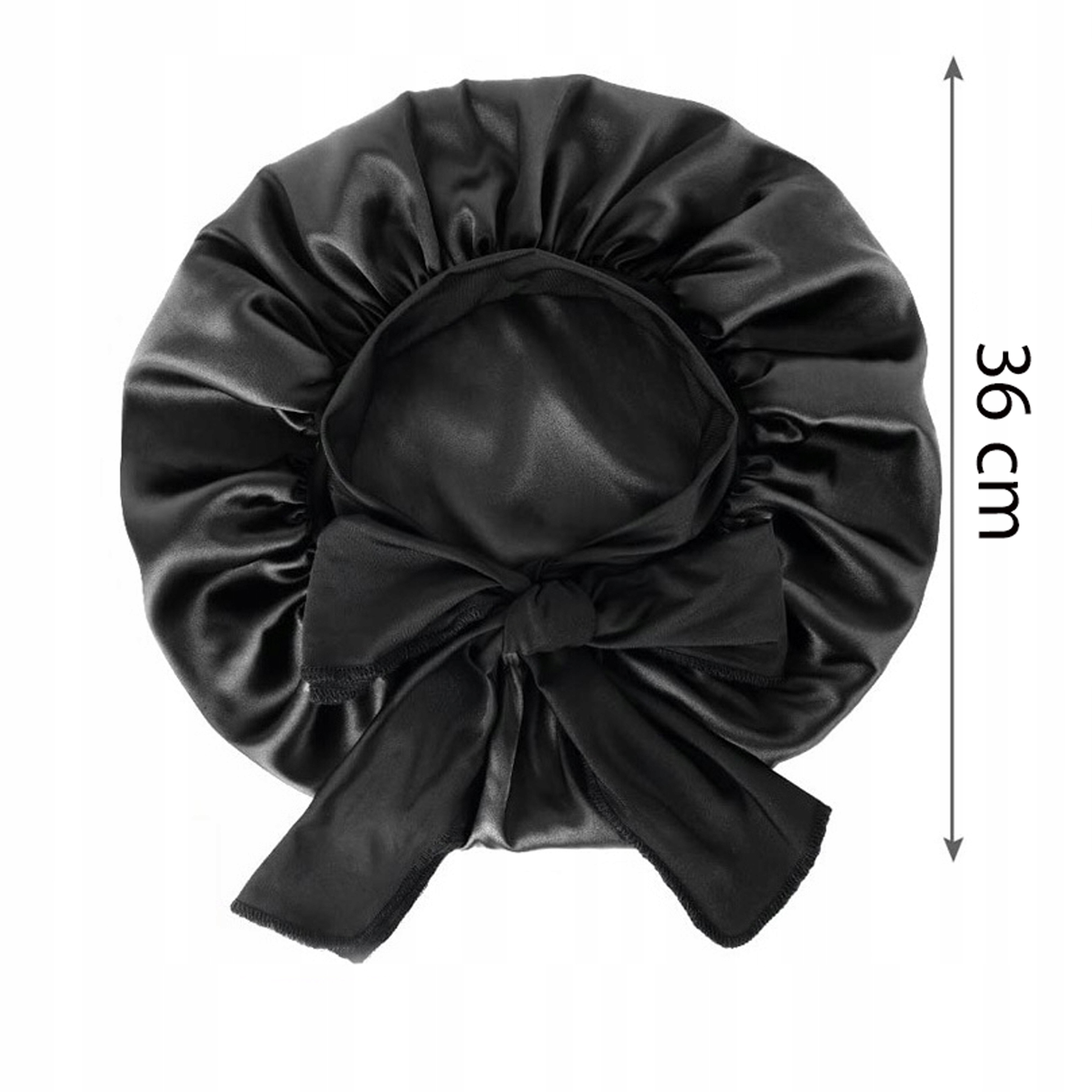 Satynowy Czepek do spania z kokardą Czarny ochronny zabezpieczający włosy