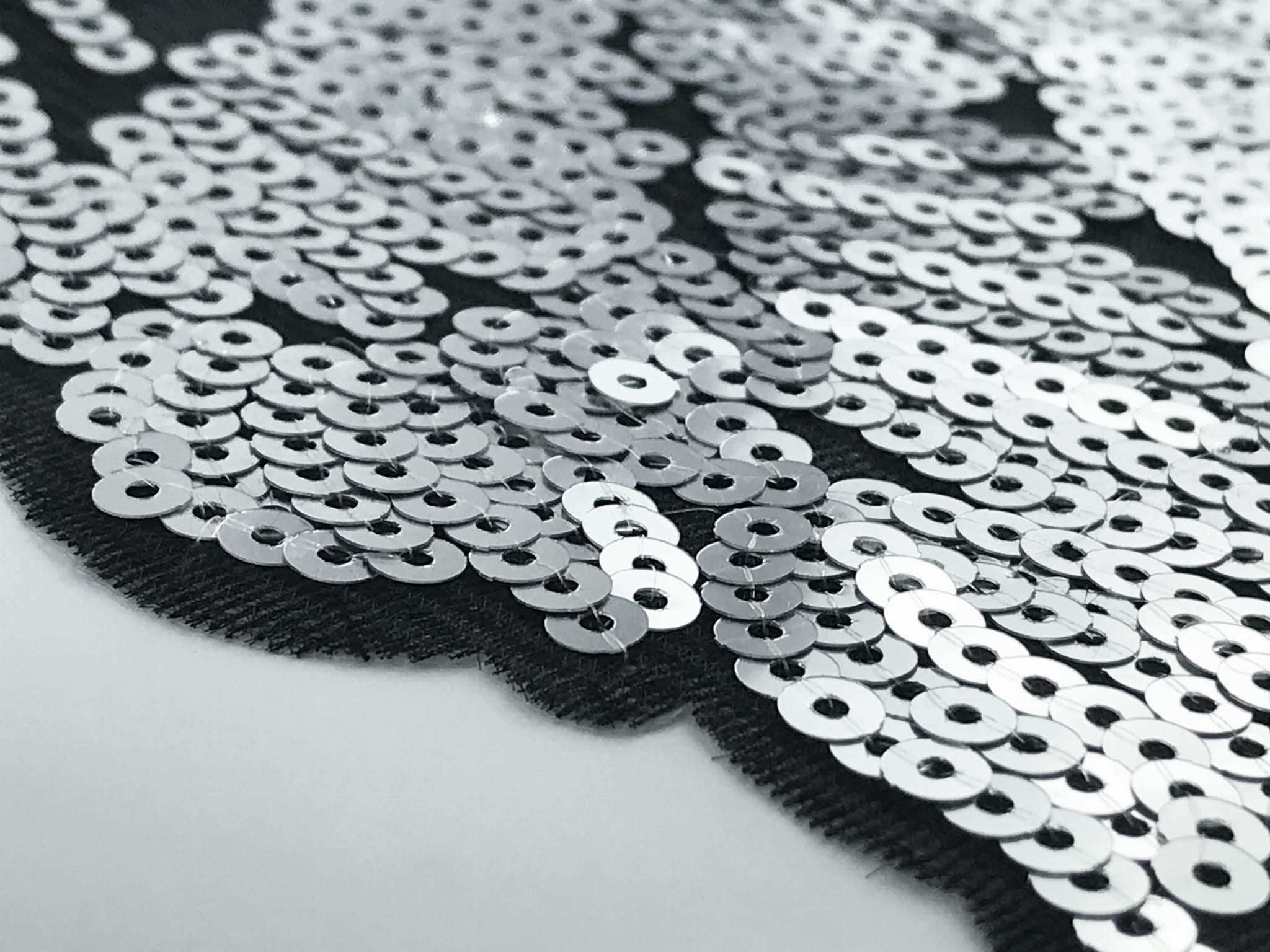 Materiał: srebrne cekiny na czarnej siatce z klejem termo