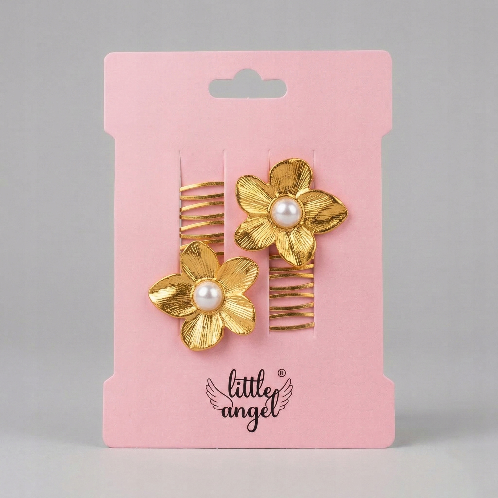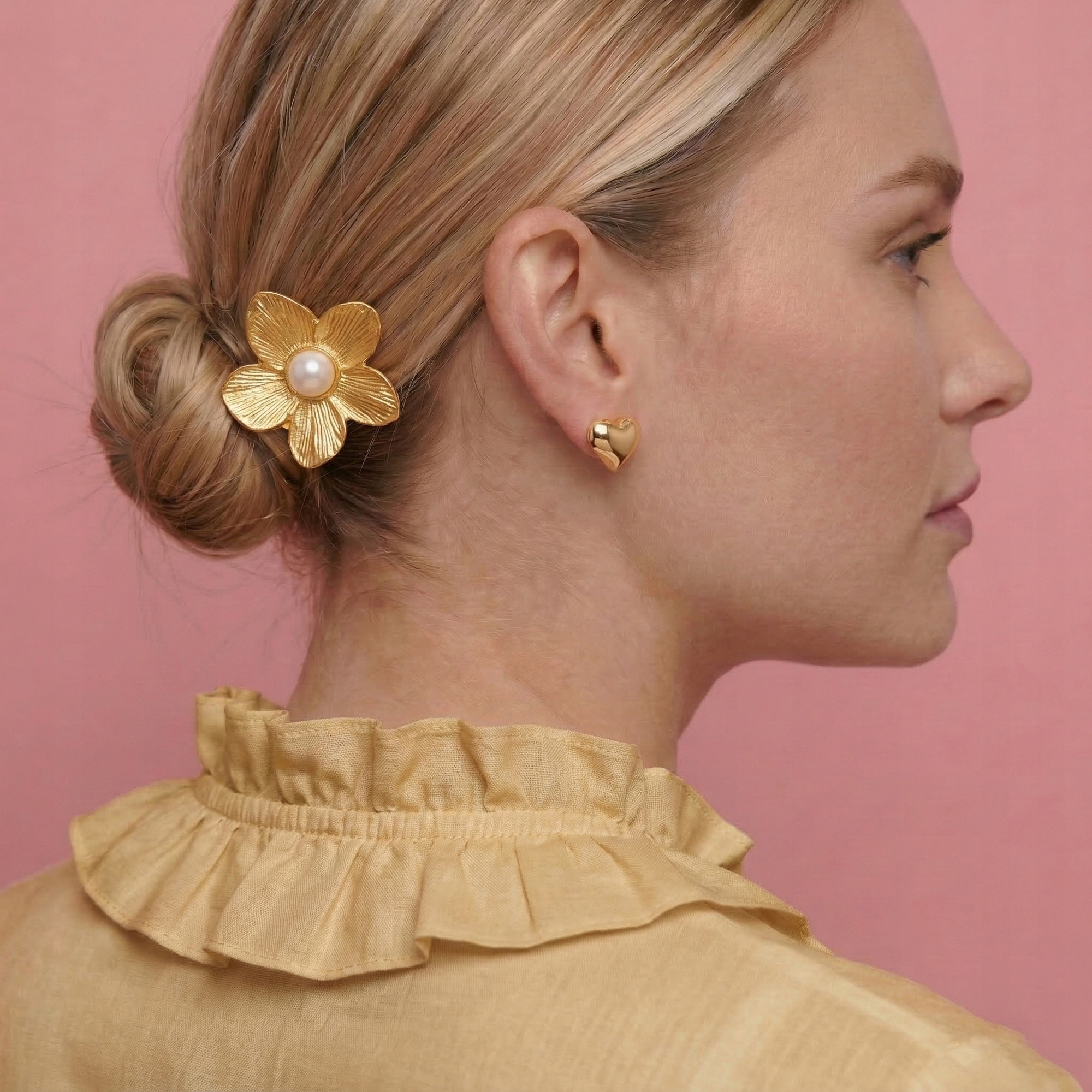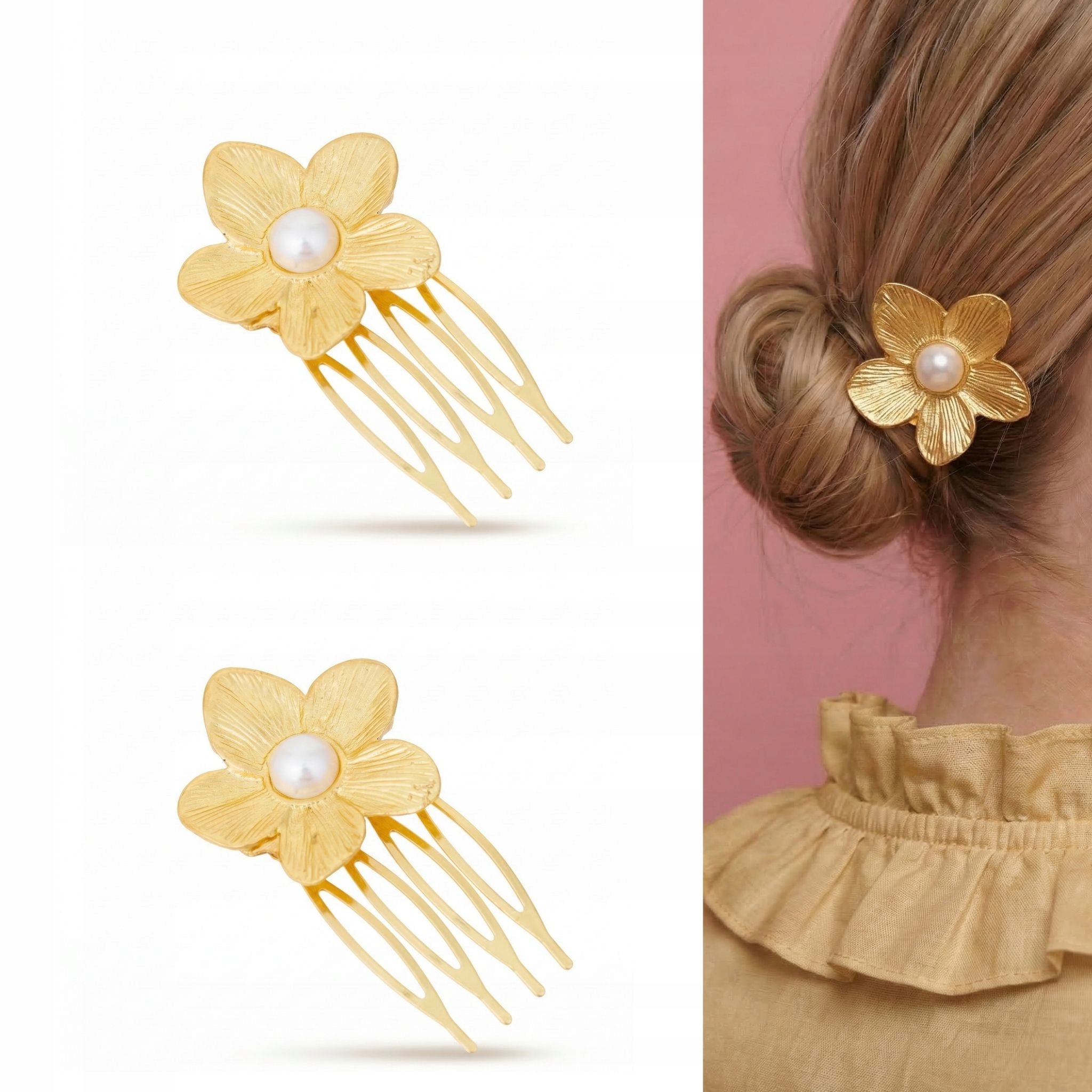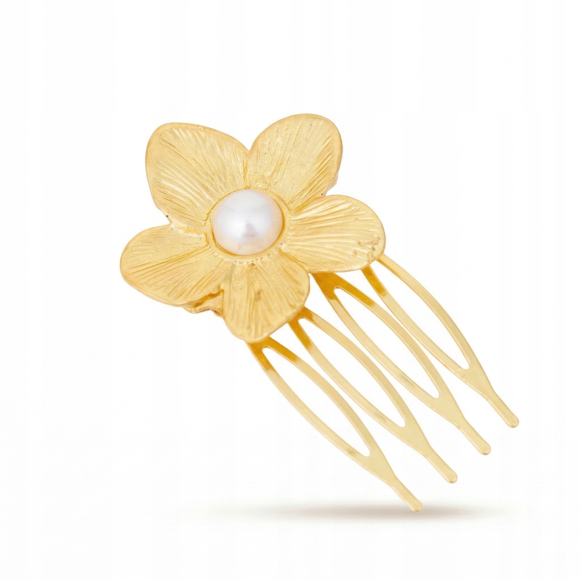 Elegancka ozdoba do włosów w kształcie kwiatu z perłą to stylowy dodatek, który podkreśli wyjątkowy charakter każdej fryzury. Złoty kwiat z subtelną perłą w centrum tworzy klasyczną i ponadczasową kompozycję inspirowaną naturalnym pięknem.