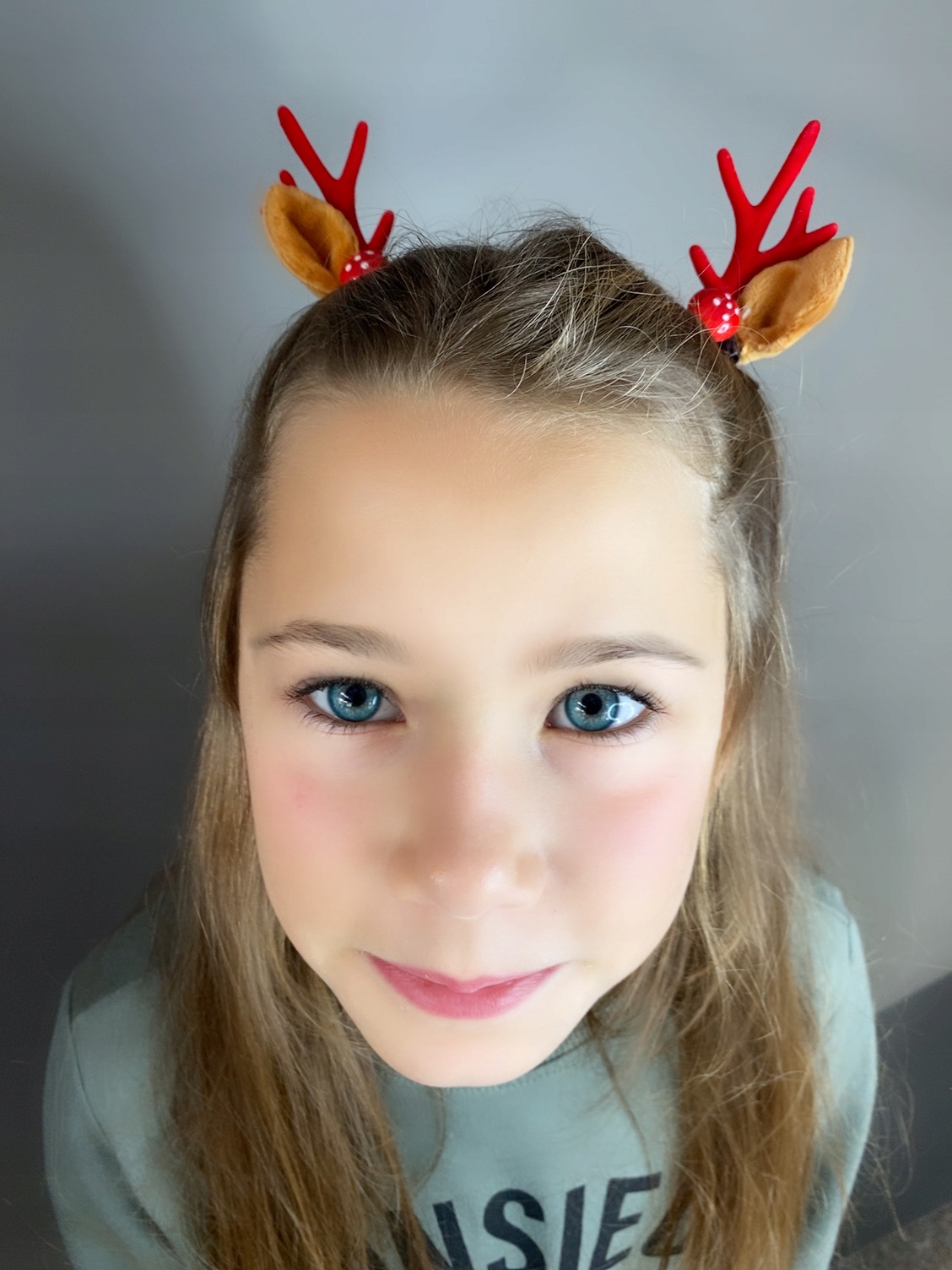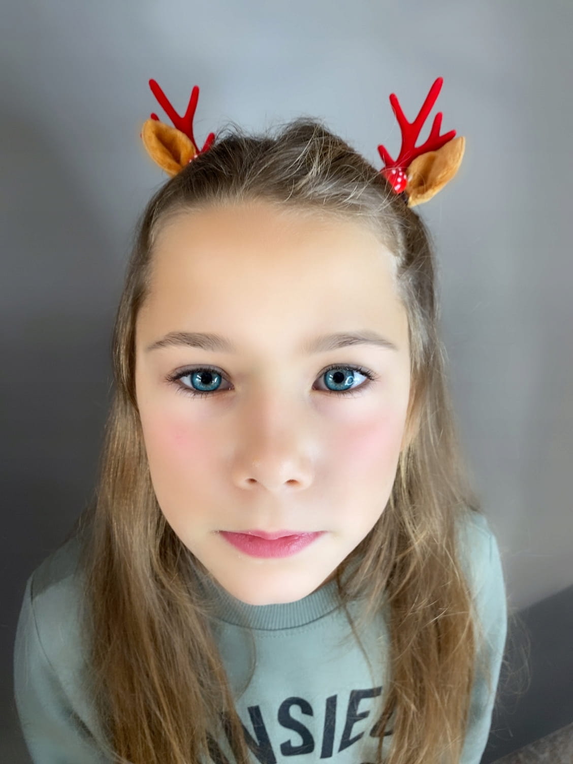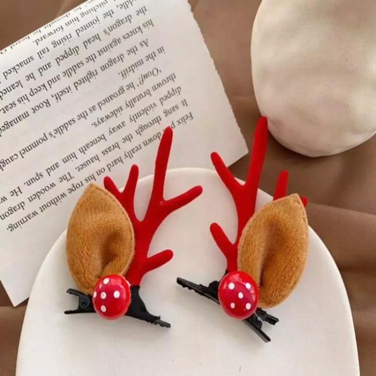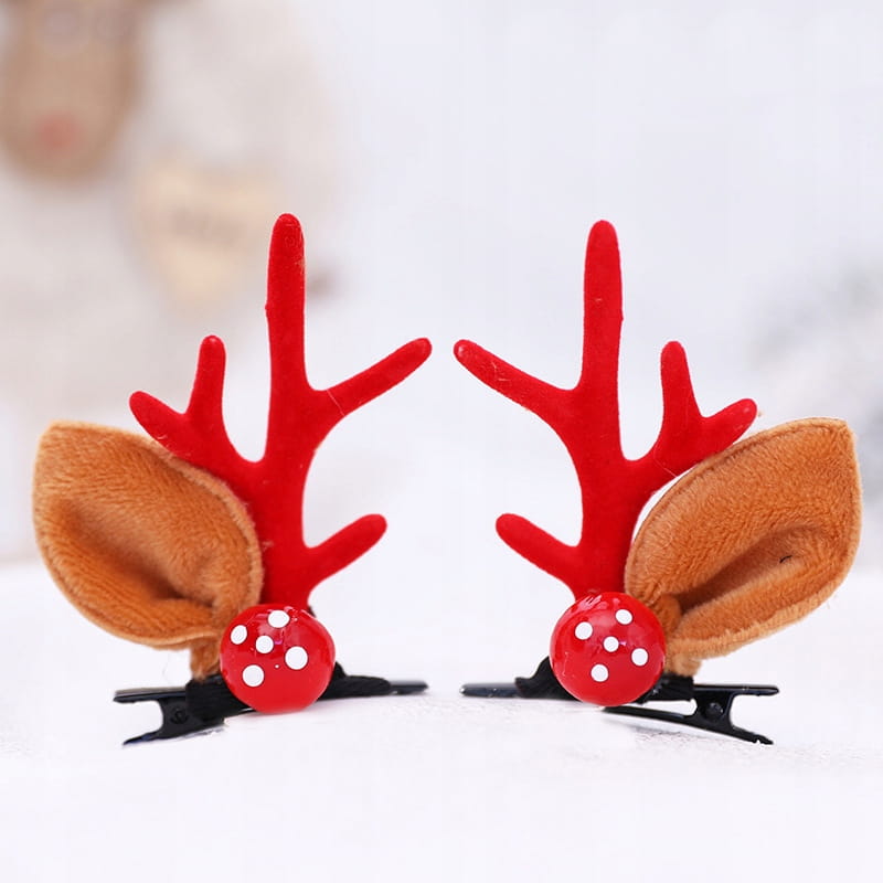 Opaska z uszkami, rogami i czerwoni ozdobami.
