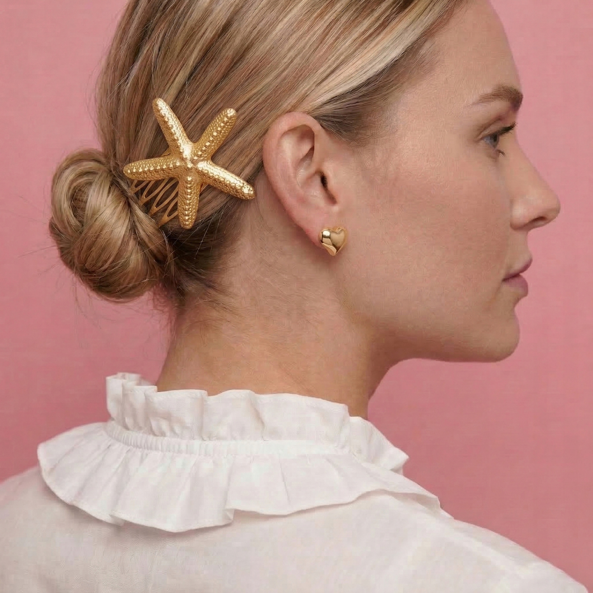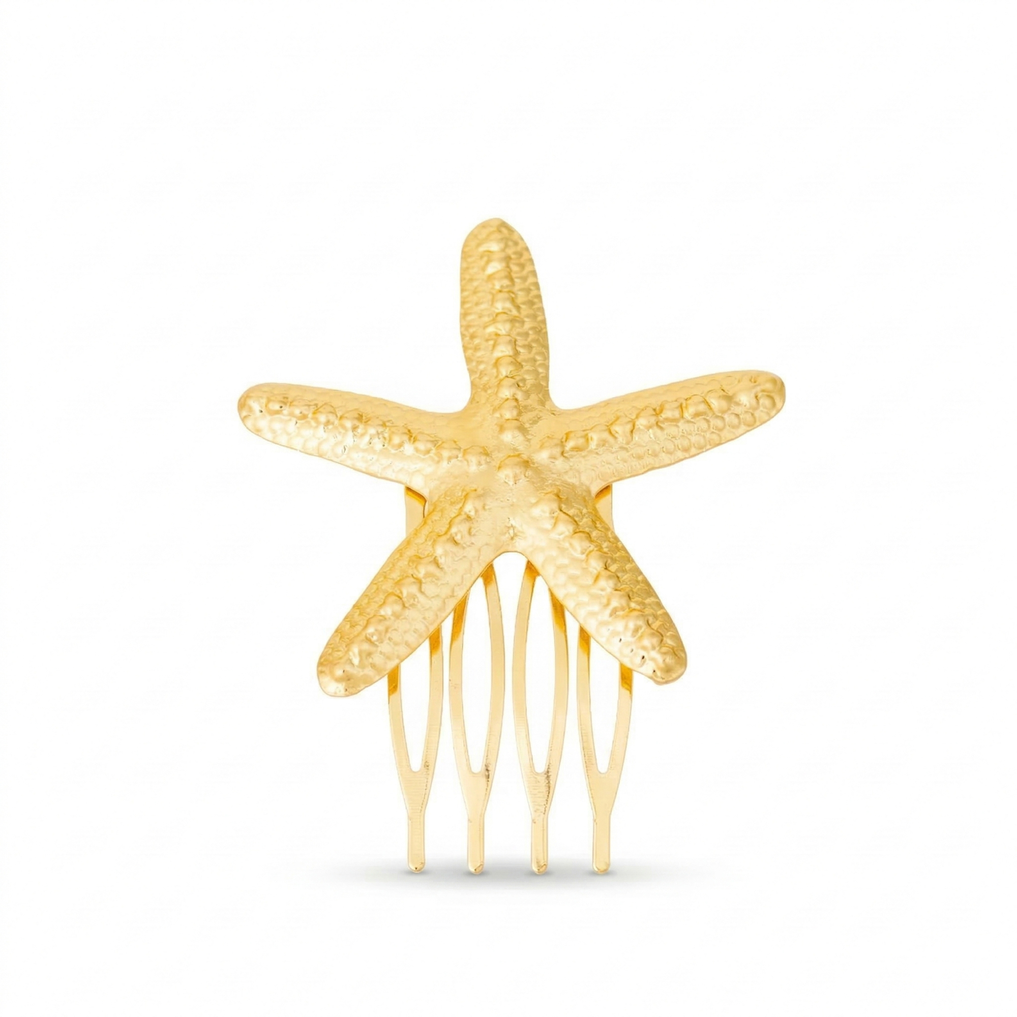 Eleganckie spinki do włosów w kształcie rozgwiazdy to wyjątkowa ozdoba, która nada fryzurze stylowego i oryginalnego charakteru. Złoty kolor oraz dekoracyjna faktura inspirowana motywem morskim sprawiają, że spinki przyciągają spojrzenia i pięknie podkreślają każdą stylizację.