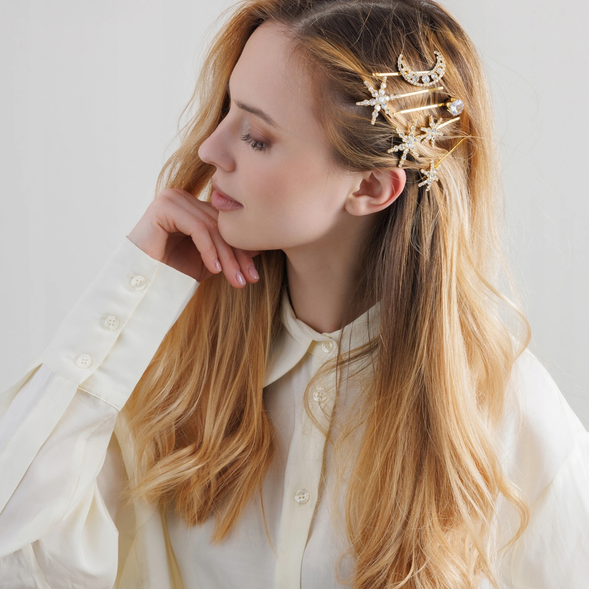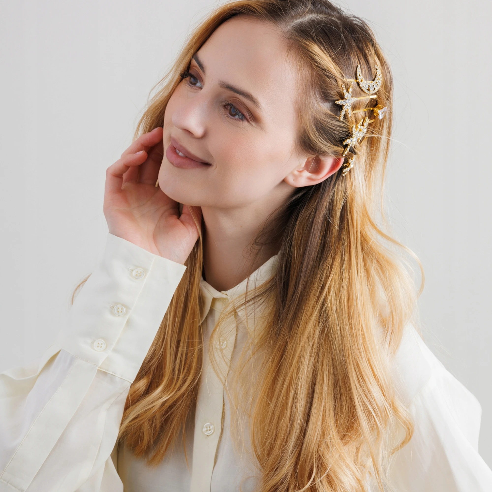 Delikatny blask kryształków sprawia, że włosy wyglądają jak ozdobione biżuterią.