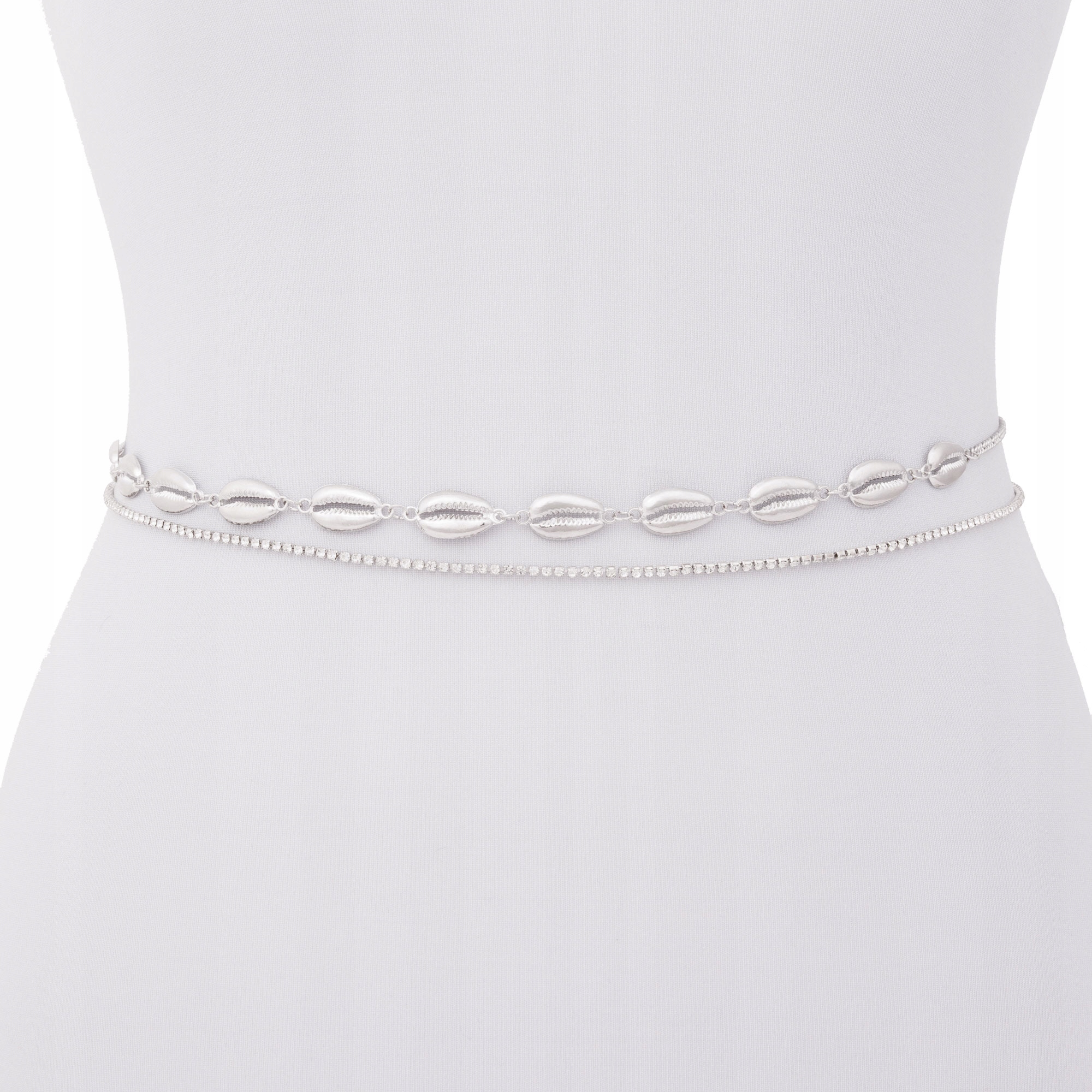 Srebrny łańcuszek na brzuch tunikę podwójny pasek z muszelkami i cyrkoniami