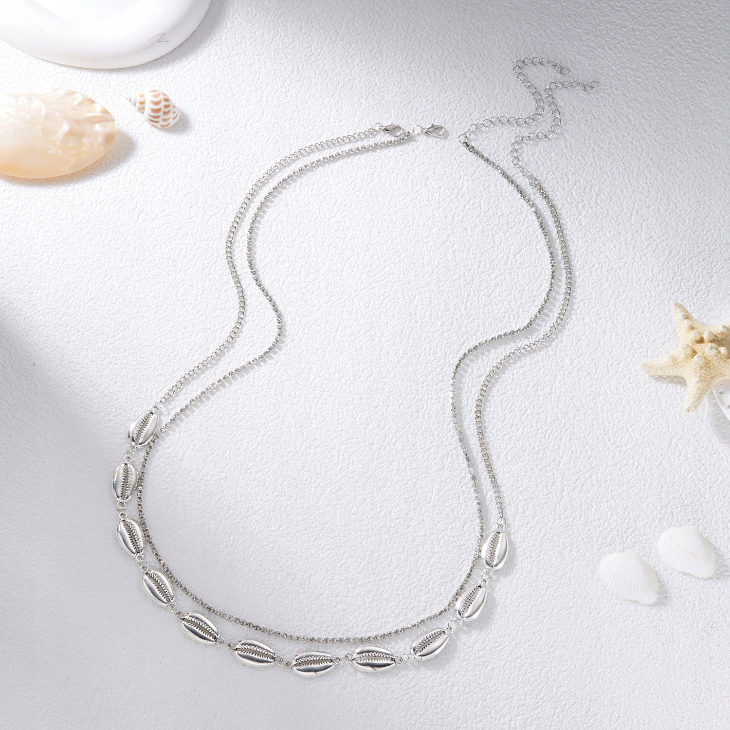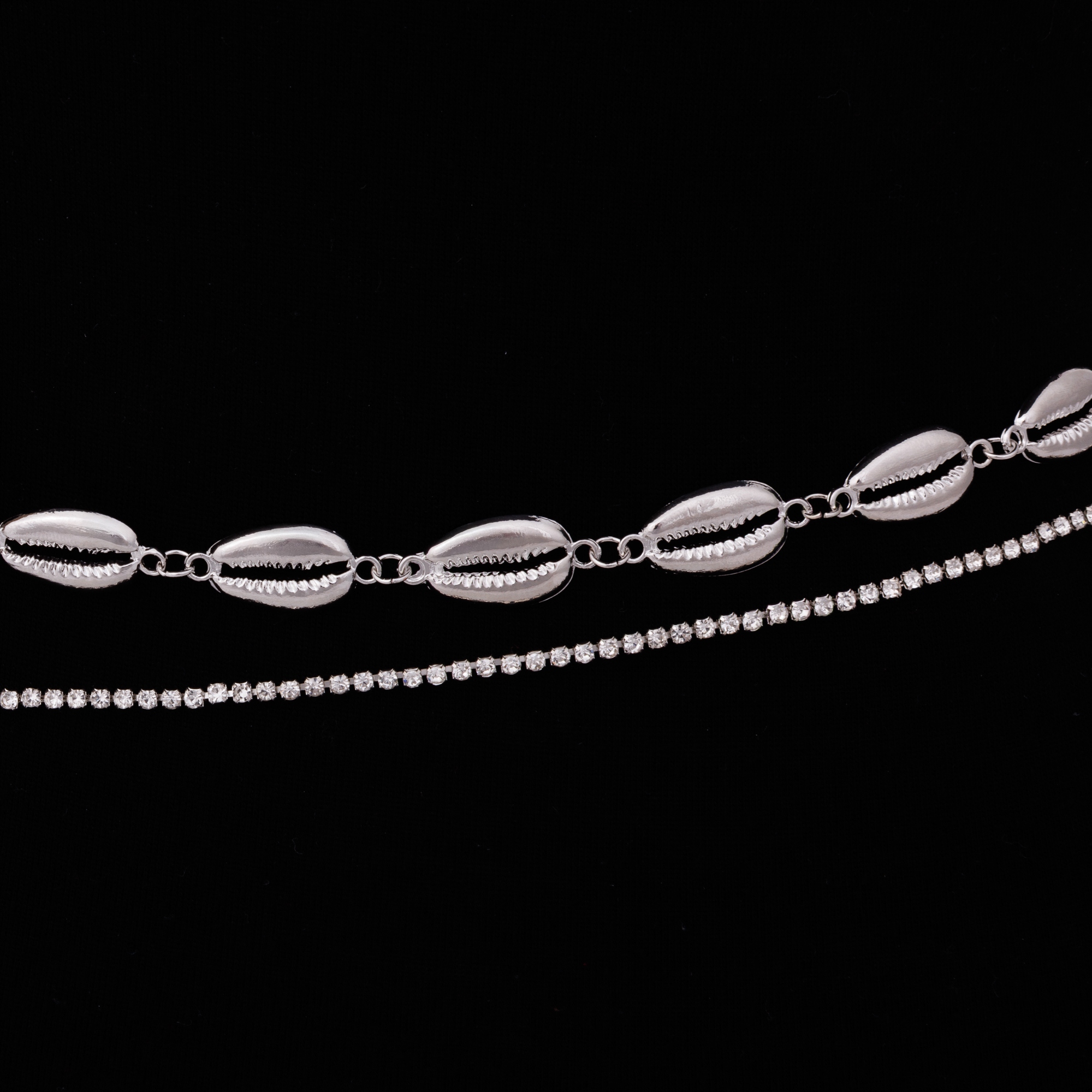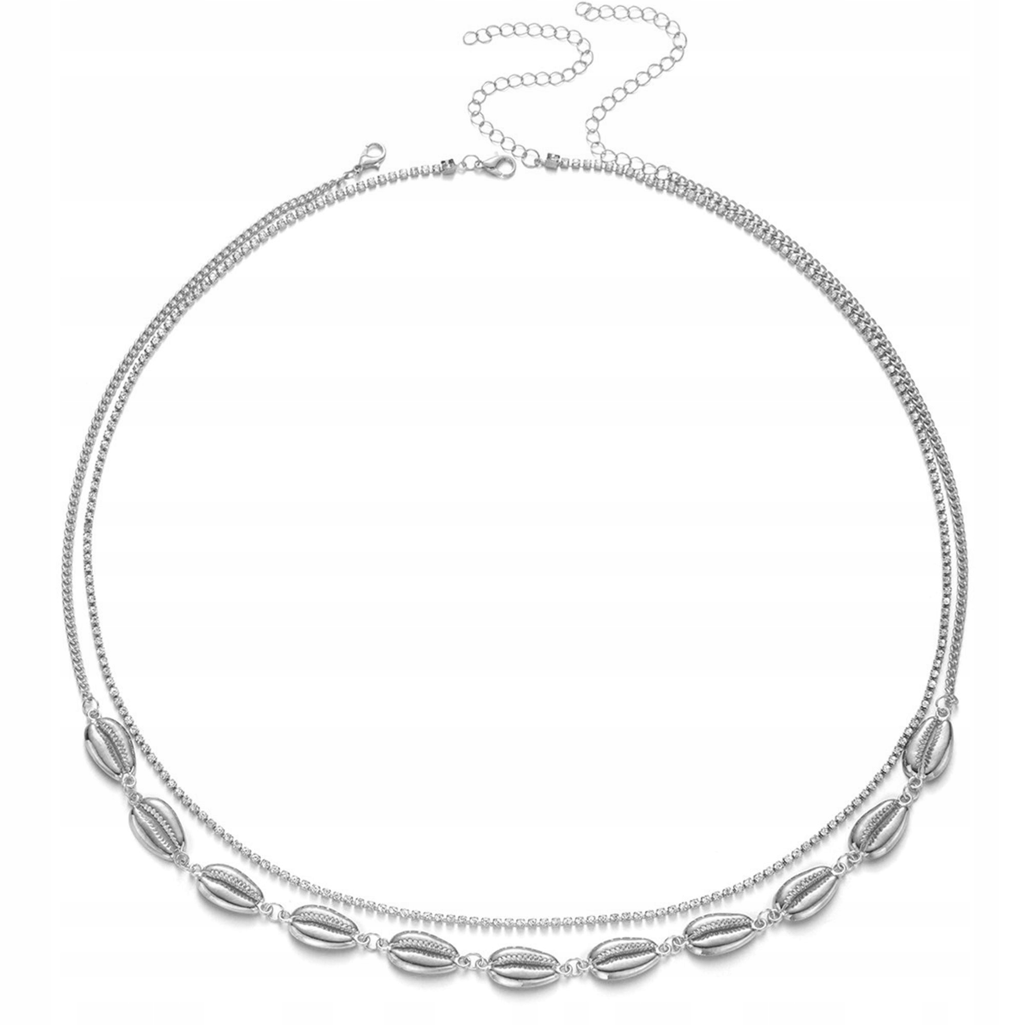 Styl boho w eleganckim, srebrnym wydaniu – muszelki cowrie połączone z delikatnym łańcuszkiem wysadzanym drobnymi cyrkoniami tworzą efektowny, ale lekki dodatek.