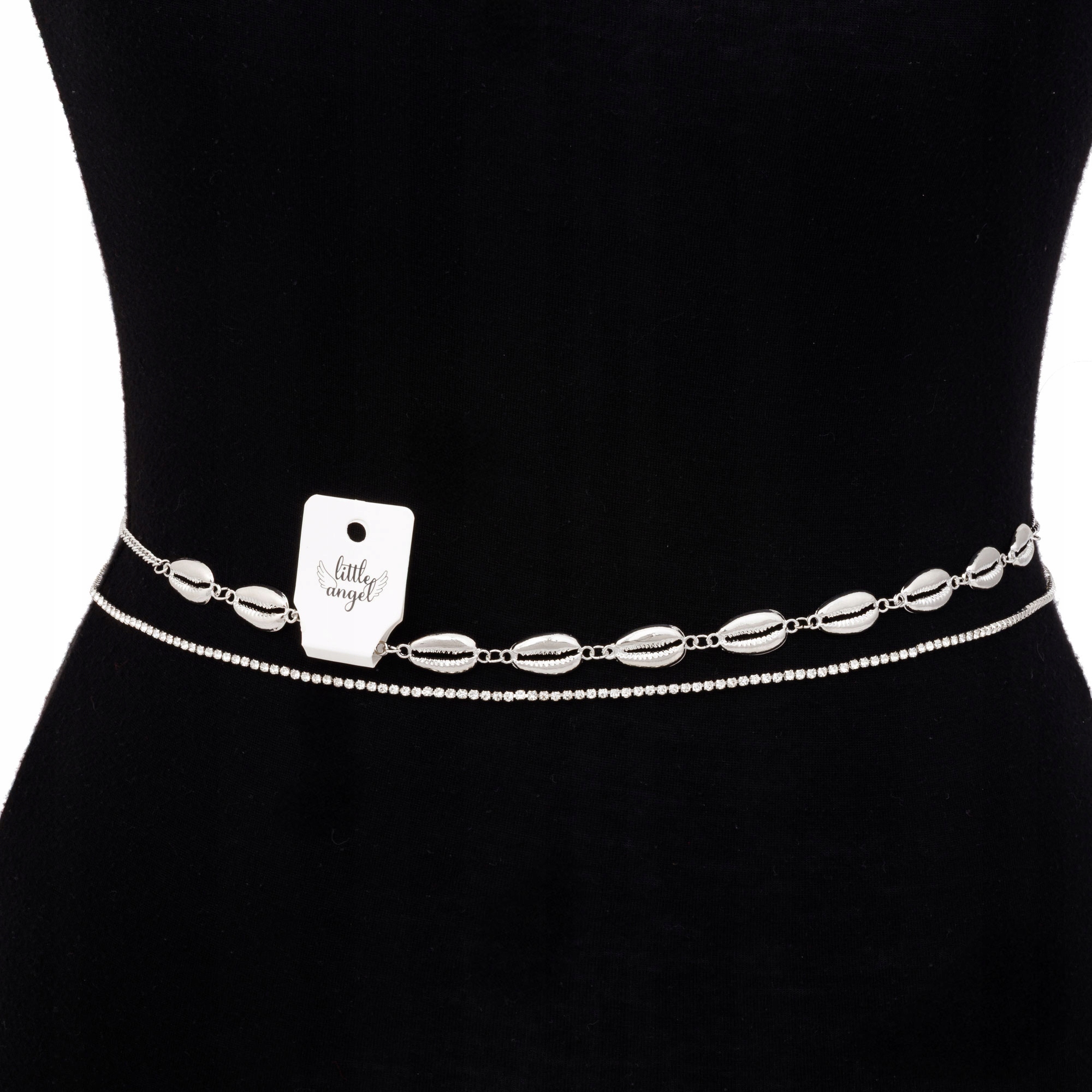 Srebrny łańcuszek na brzuch z muszelkami i cyrkoniami Little Angel – podwójna biżuteria na ciało, pasek plażowy
