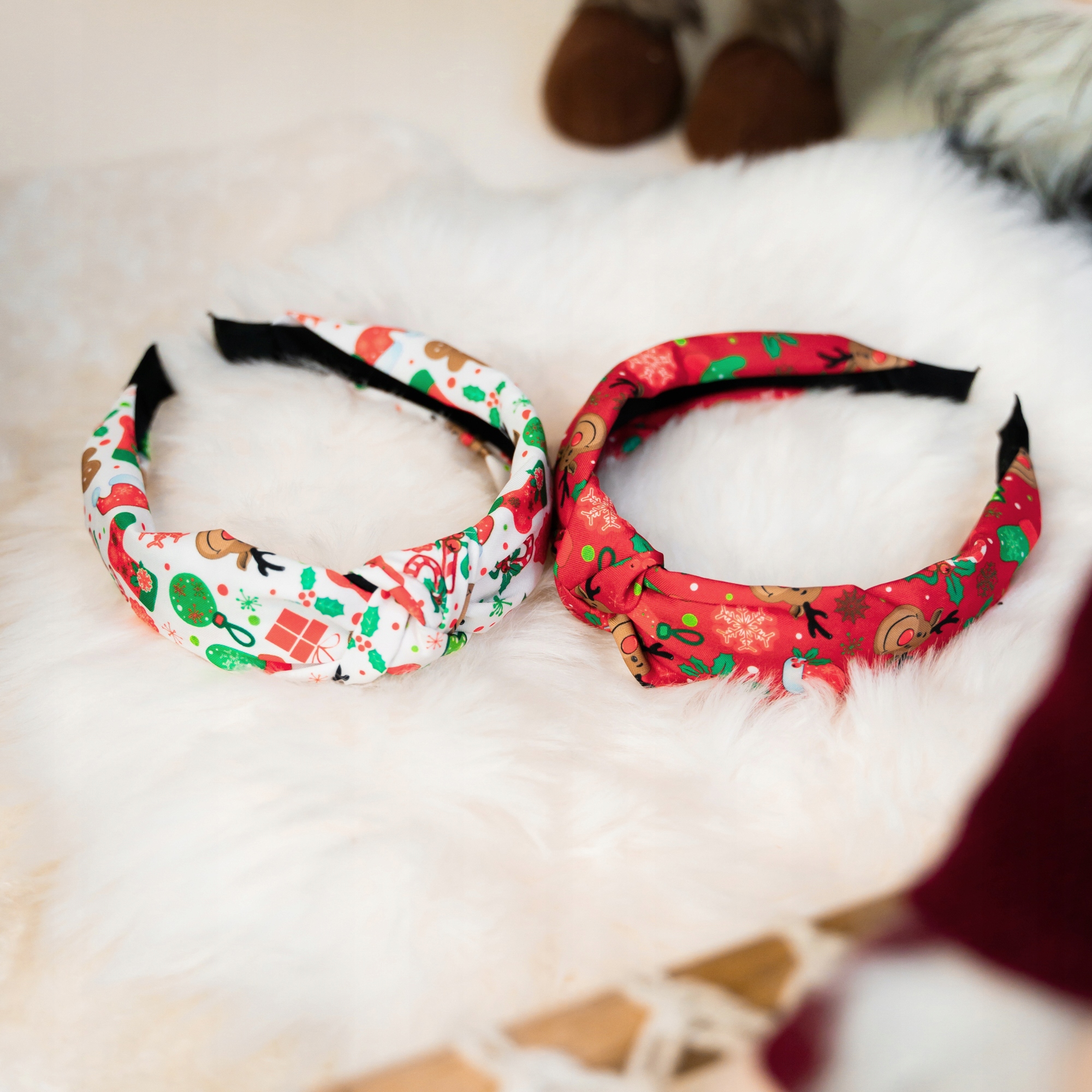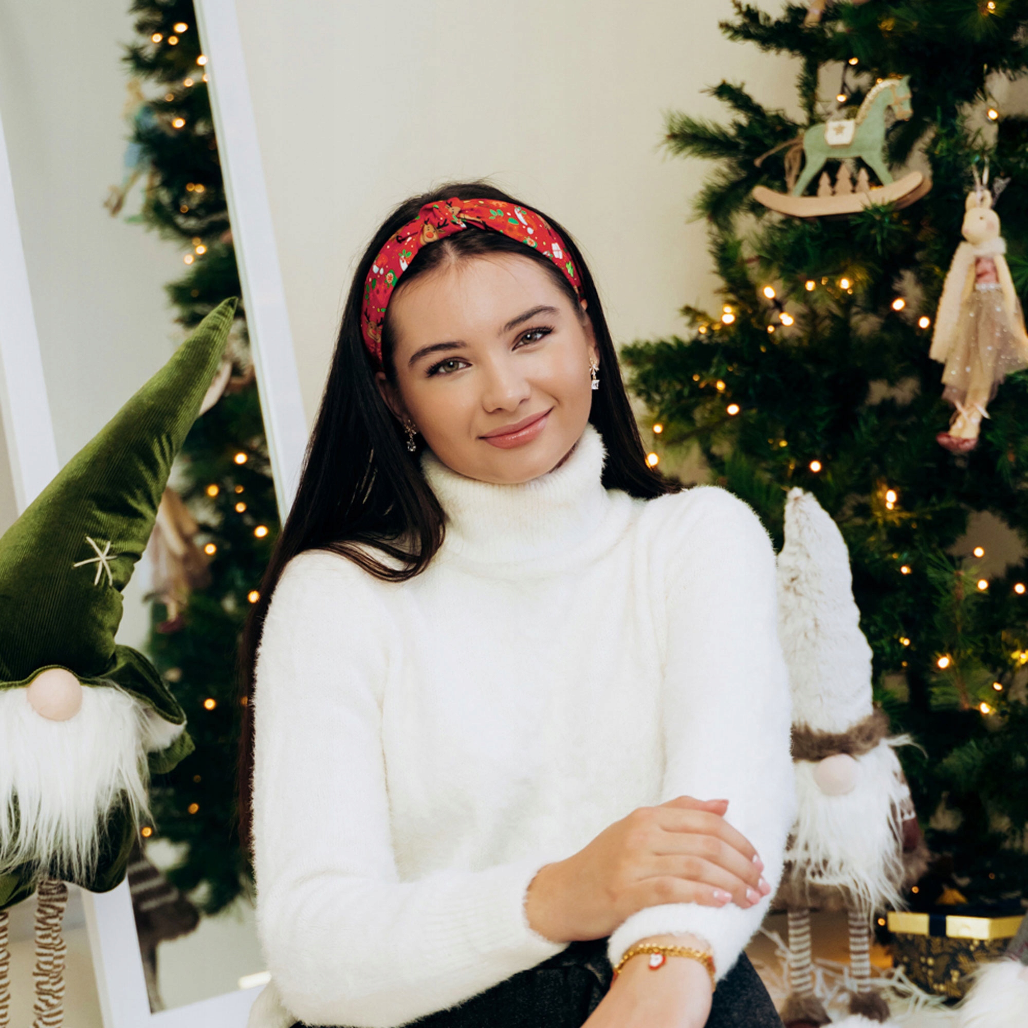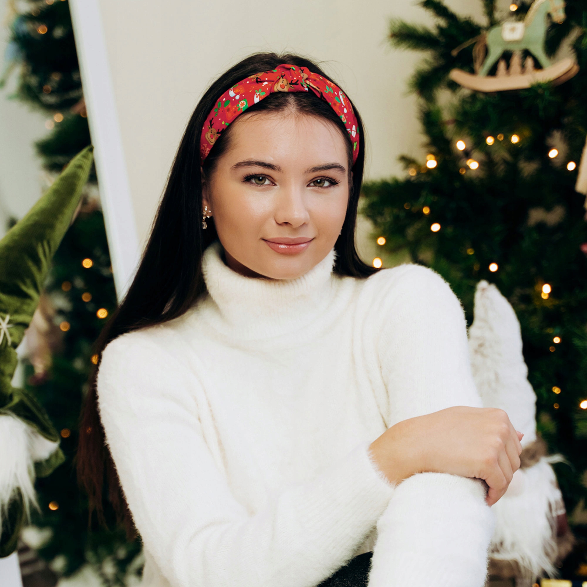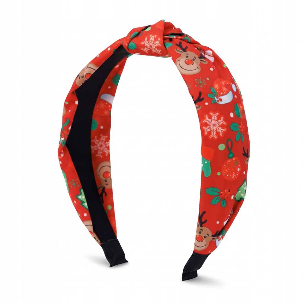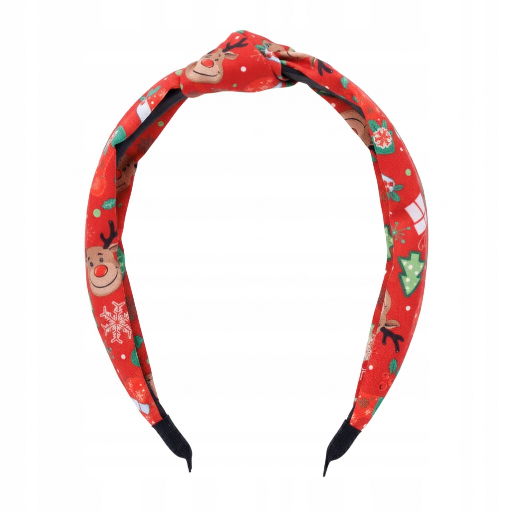 Dodaj odrobinę bożonarodzeniowego uroku do swoich stylizacji dzięki tej uroczej, czerwonej opasce świątecznej do włosów z motywami reniferów, bombek, choinek i śnieżynek.