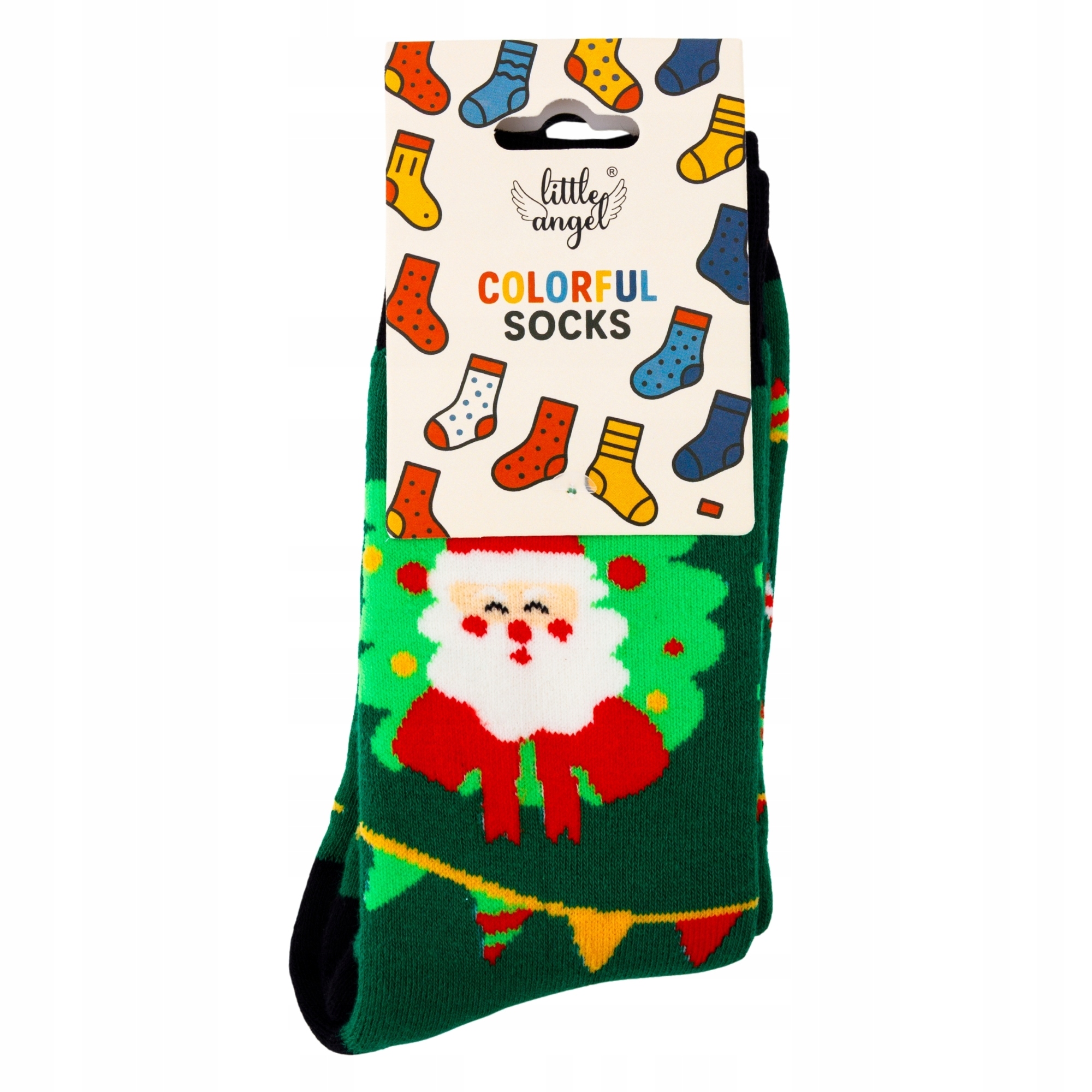 Rozświetl zimowe dni świątecznymi skarpetkami Little Angel, które zachwycają żywymi kolorami i wyjątkowym wzorem. Zielone tło, uroczy Mikołaj w wieńcu, wiszące girlandy oraz cukrowe laseczki tworzą idealny motyw na grudniowy czas!