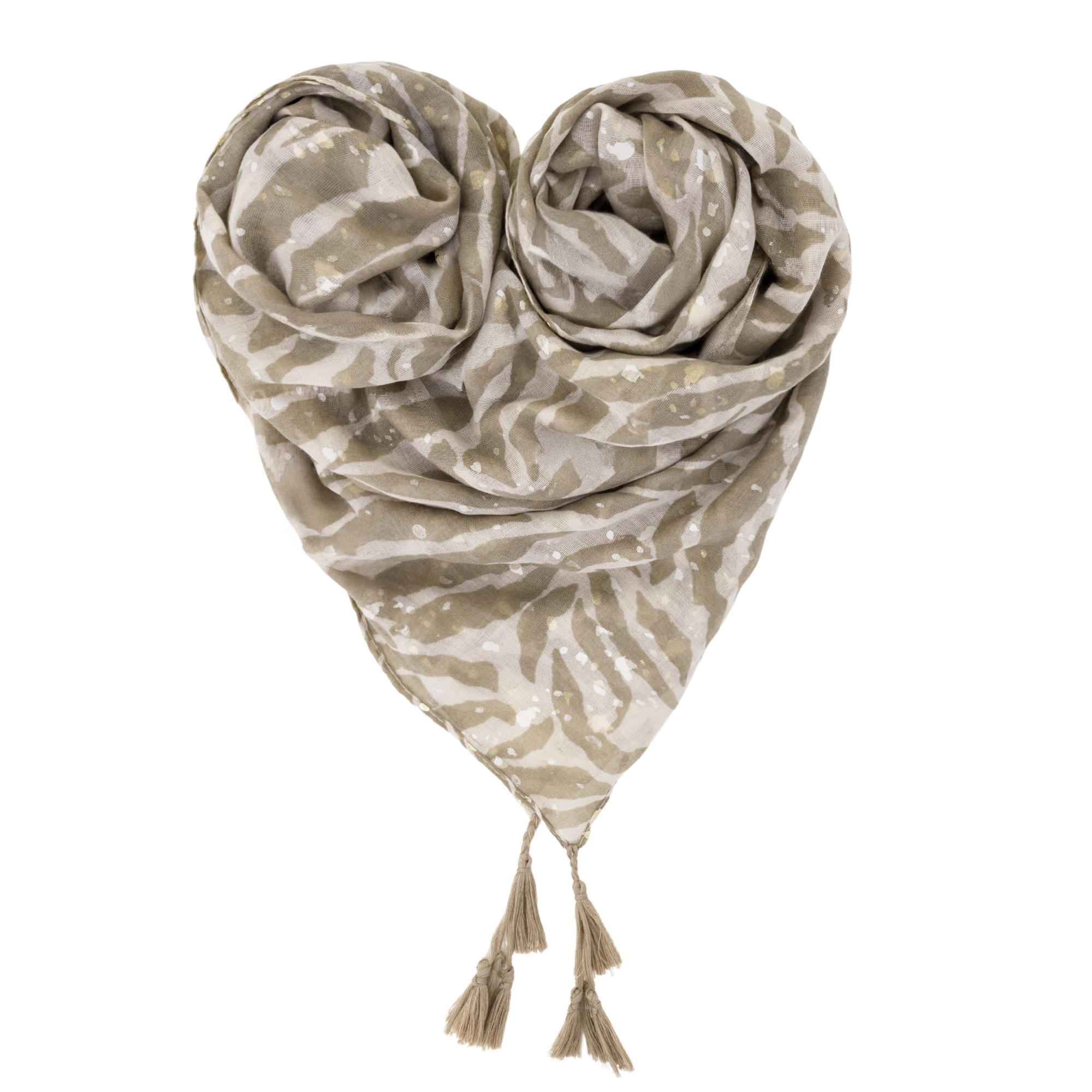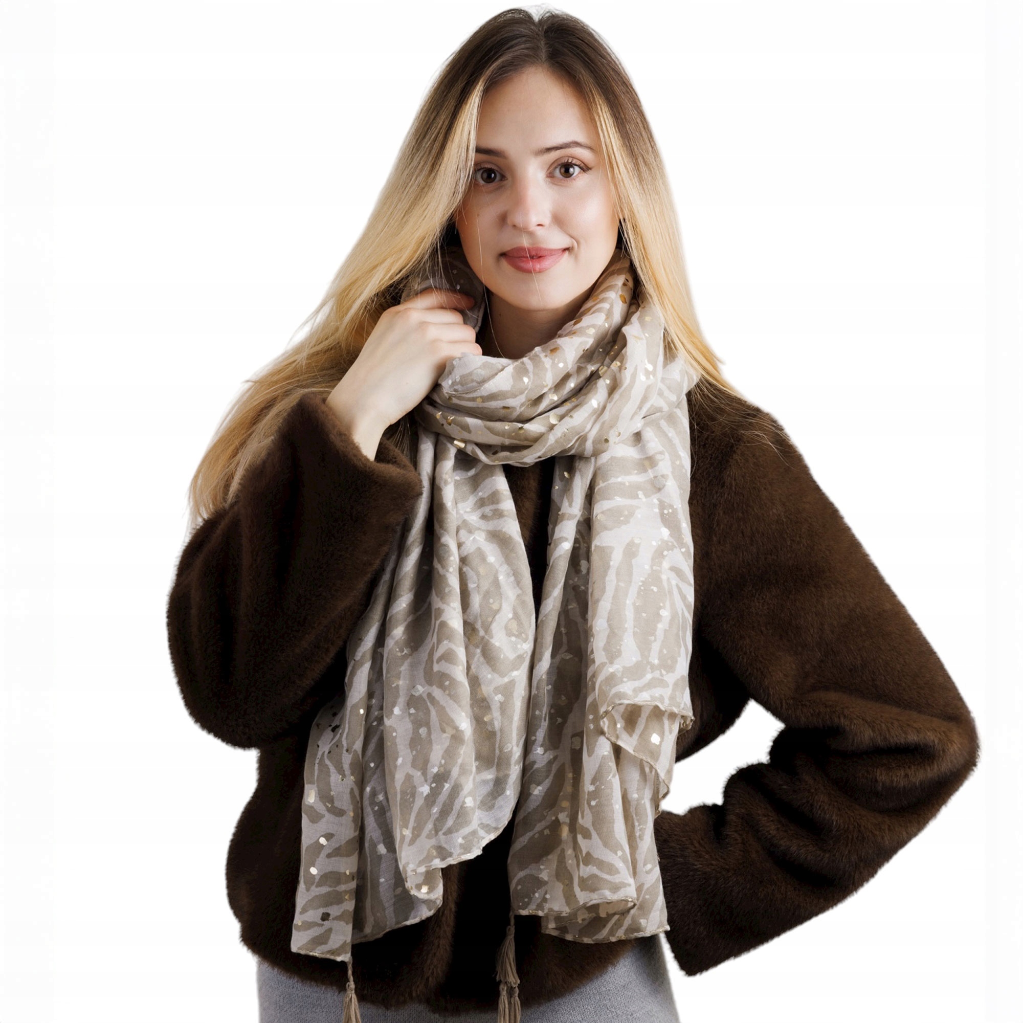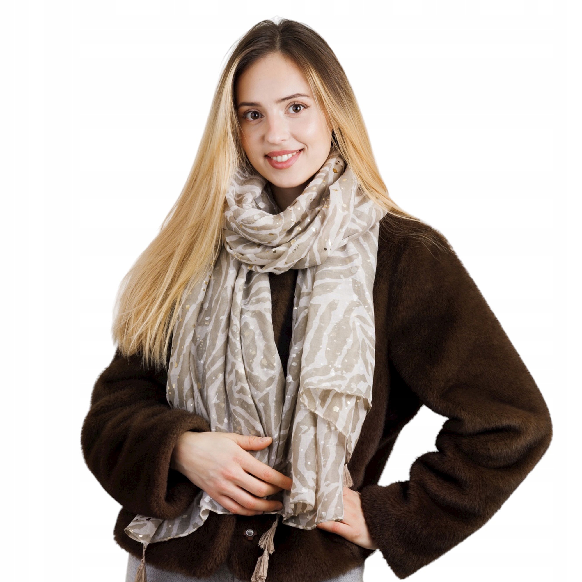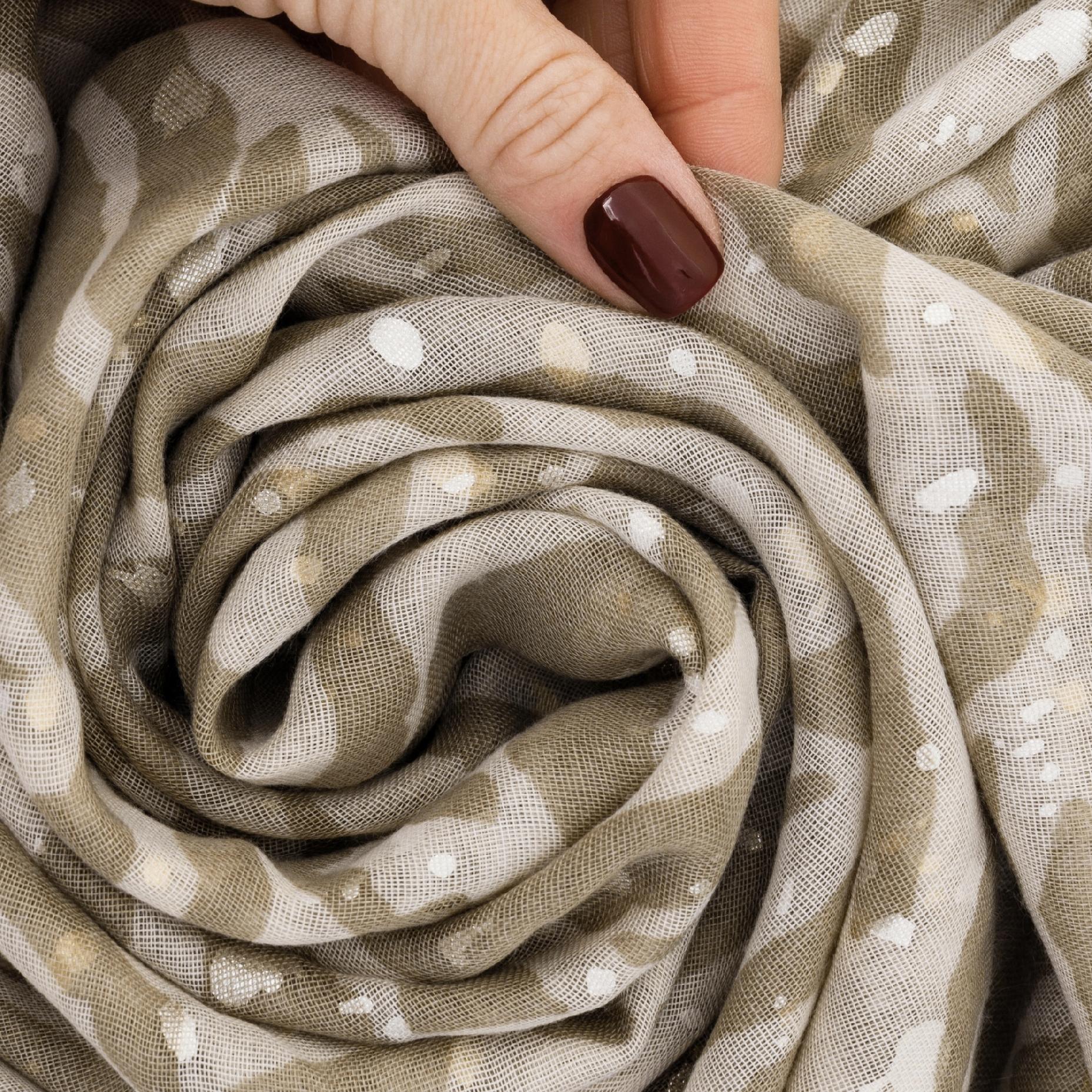 Model utrzymany jest w stonowanej, beżowej kolorystyce, która jest ponadczasowa i doskonale współgra z większością stylizacji. Wzór inspirowany jest subtelnym, organicznym motywem nawiązującym do liści i nieregularnych kształtów, a całość dopełniają metalizowane złote drobinki, które połyskują w świetle, dodając szalikowi elegancji i kobiecego wdzięku.