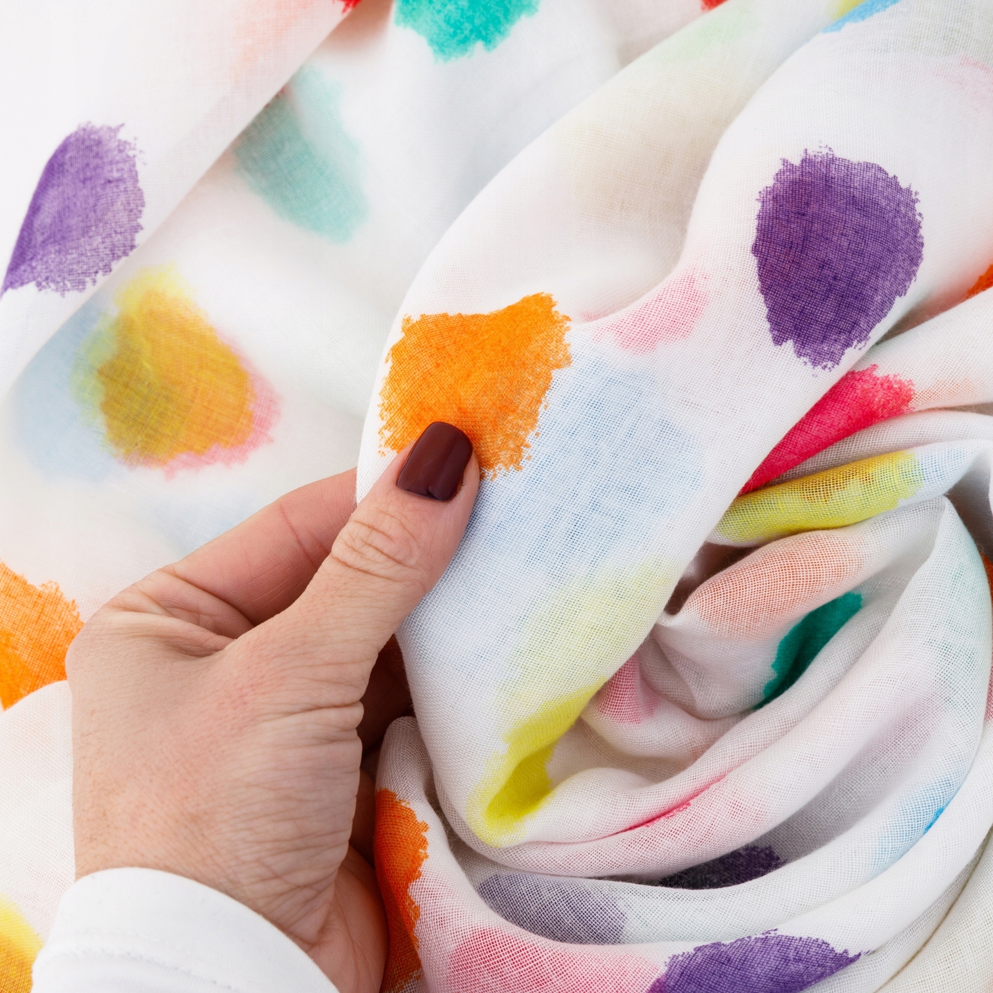Lekki szalik damski z mieszanki wiskozy i bawełny – biały z barwnymi akwarelowymi plamkami