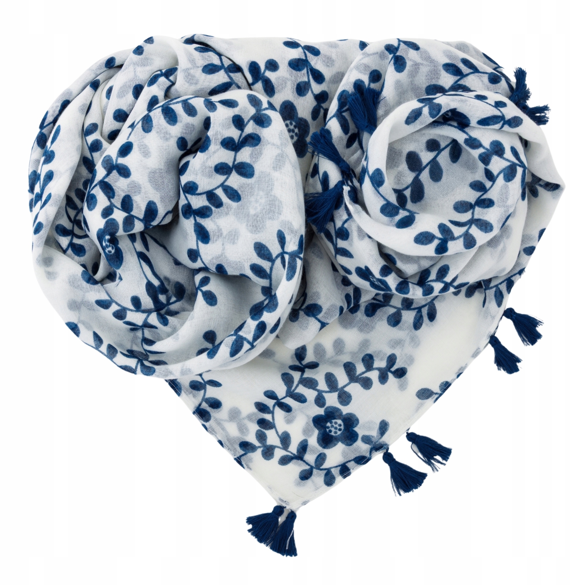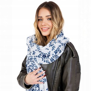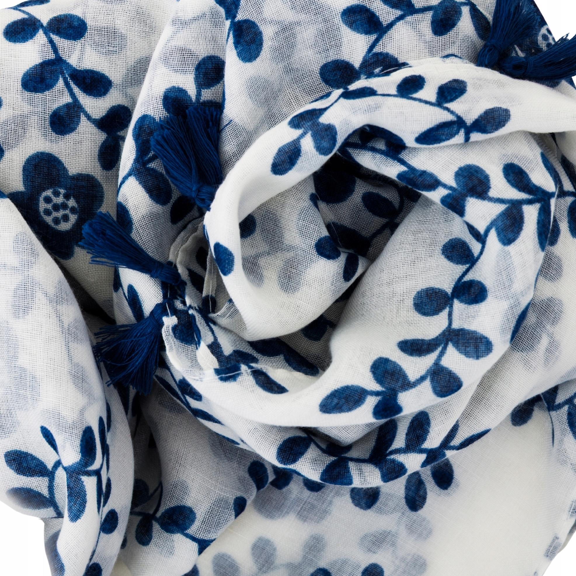 Szalik damski biały w niebieskie kwiaty lekki duży 90x180 cm z frędzlami