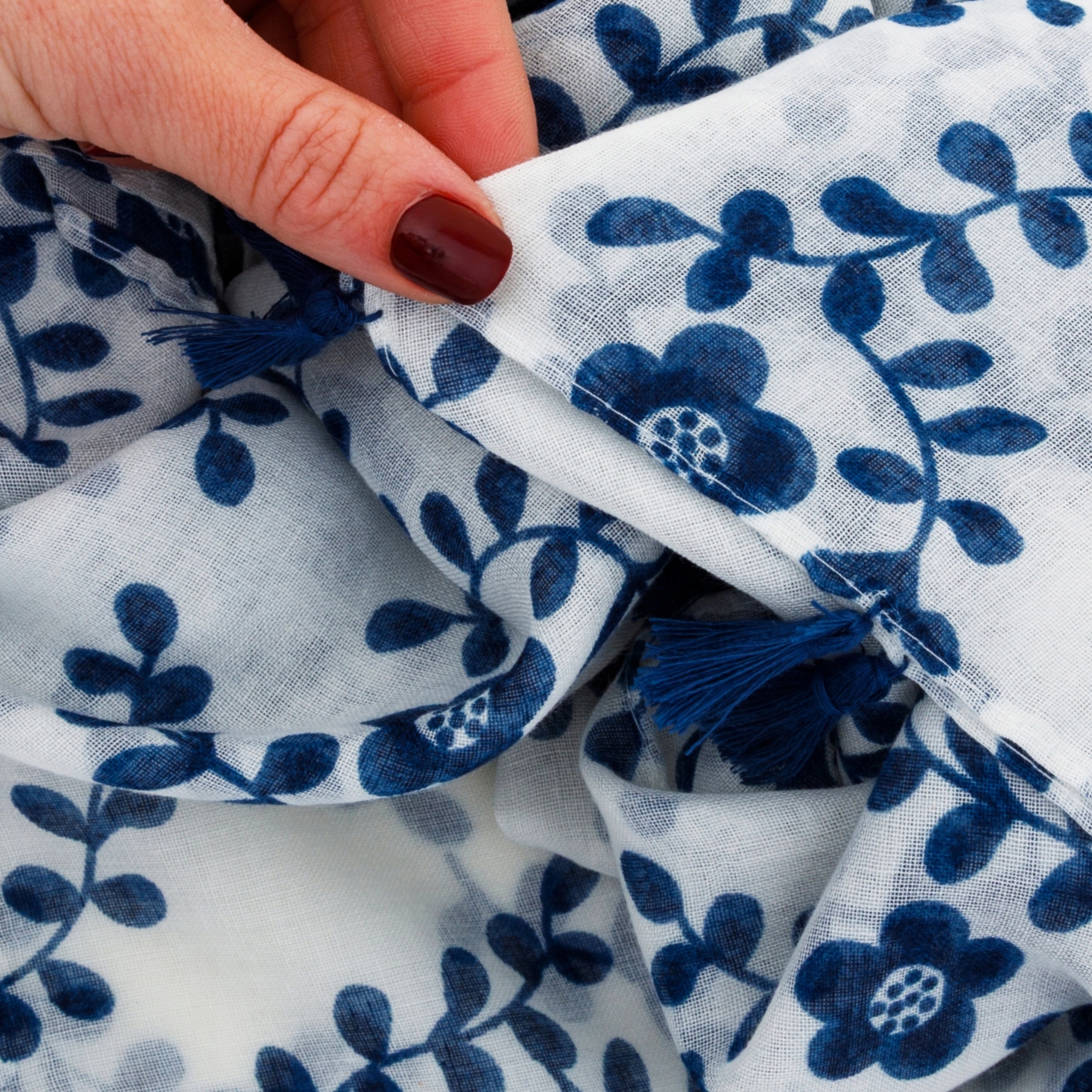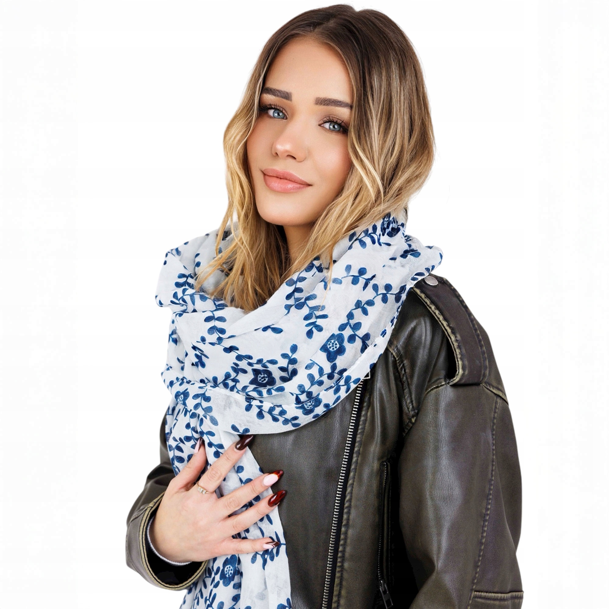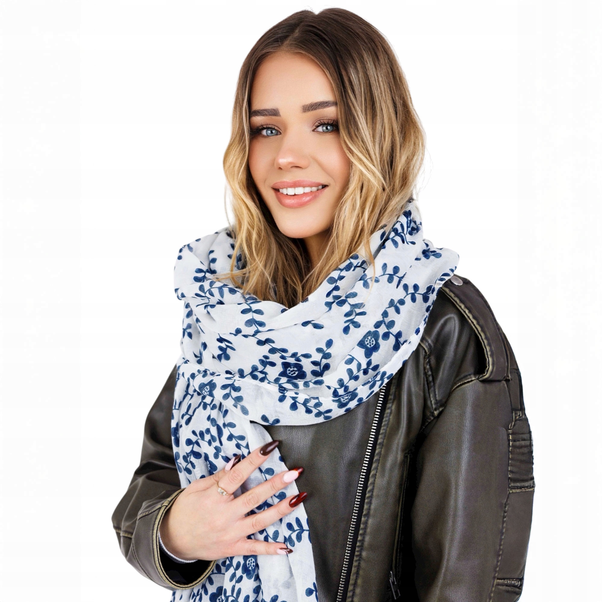 Stylowy szalik wykonany z wysokiej jakości poliestru, który jest miękki, lekki i przyjemny w dotyku. Materiał świetnie się układa, jest przewiewny, trwały oraz odporny na zagniecenia, dzięki czemu szal prezentuje się doskonale przez cały dzień. Biała tkanina ozdobiona granatowym, roślinnym wzorem nadaje całości wyjątkowego, romantycznego charakteru.