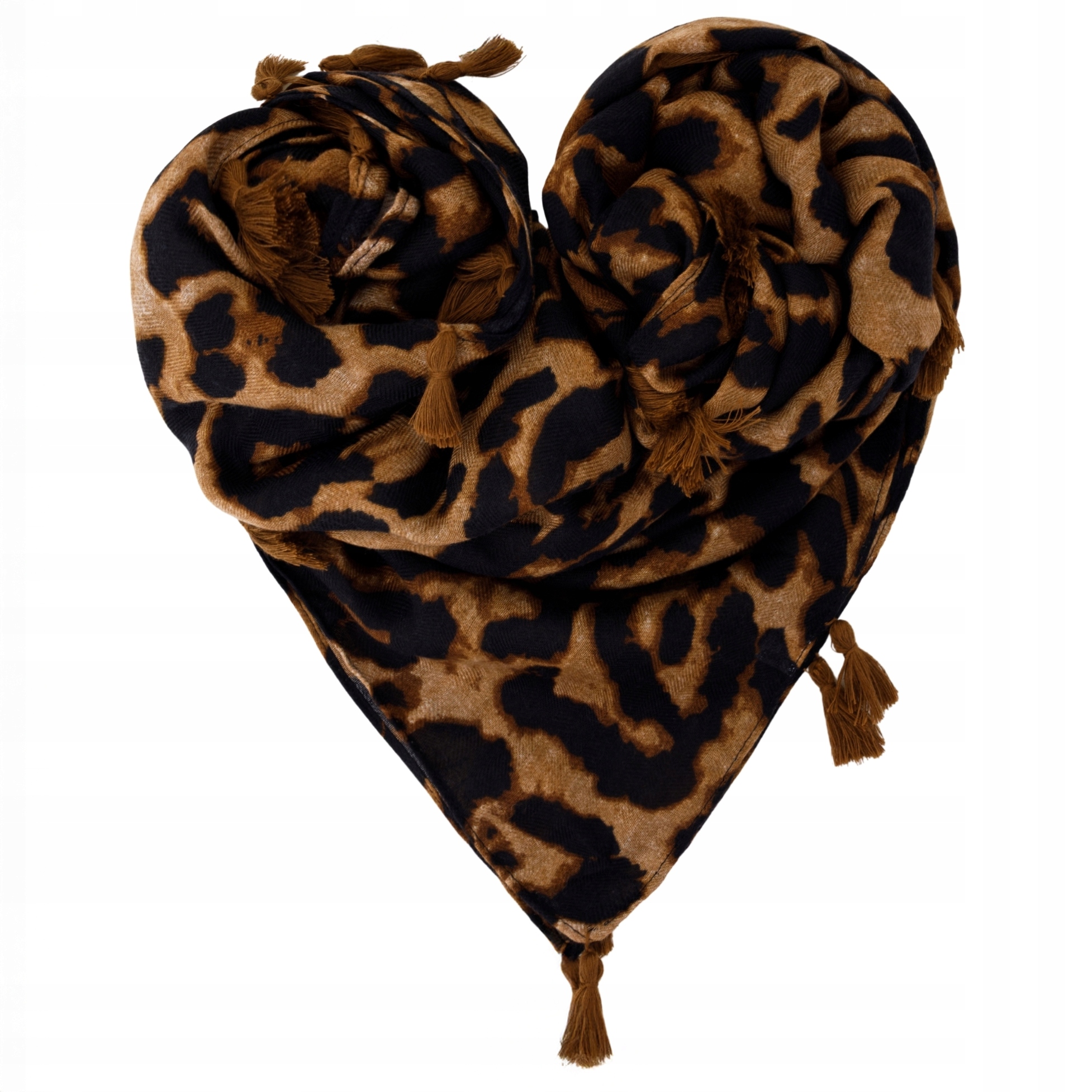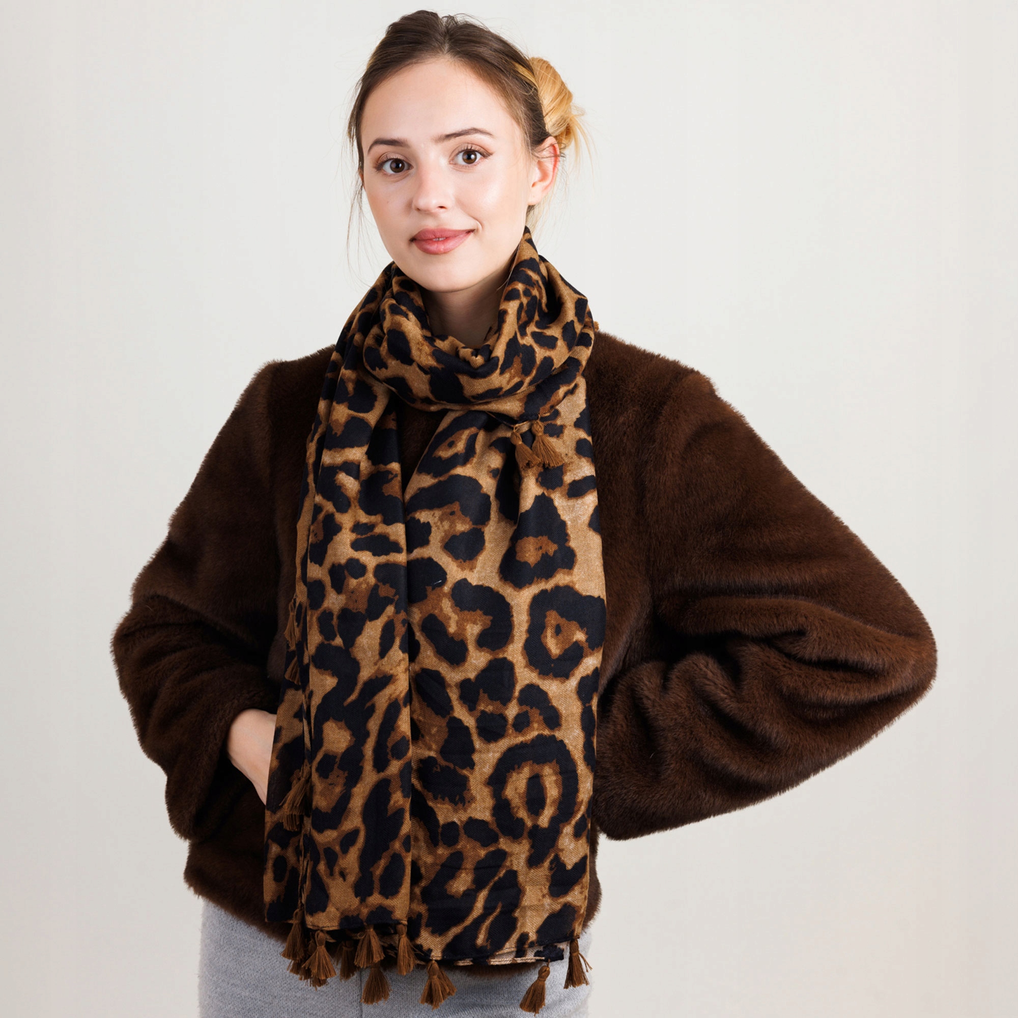 Szalik damski ciepły z frędzlami – panterka brązowa – miękki, duży, zimowy, modny wzór
