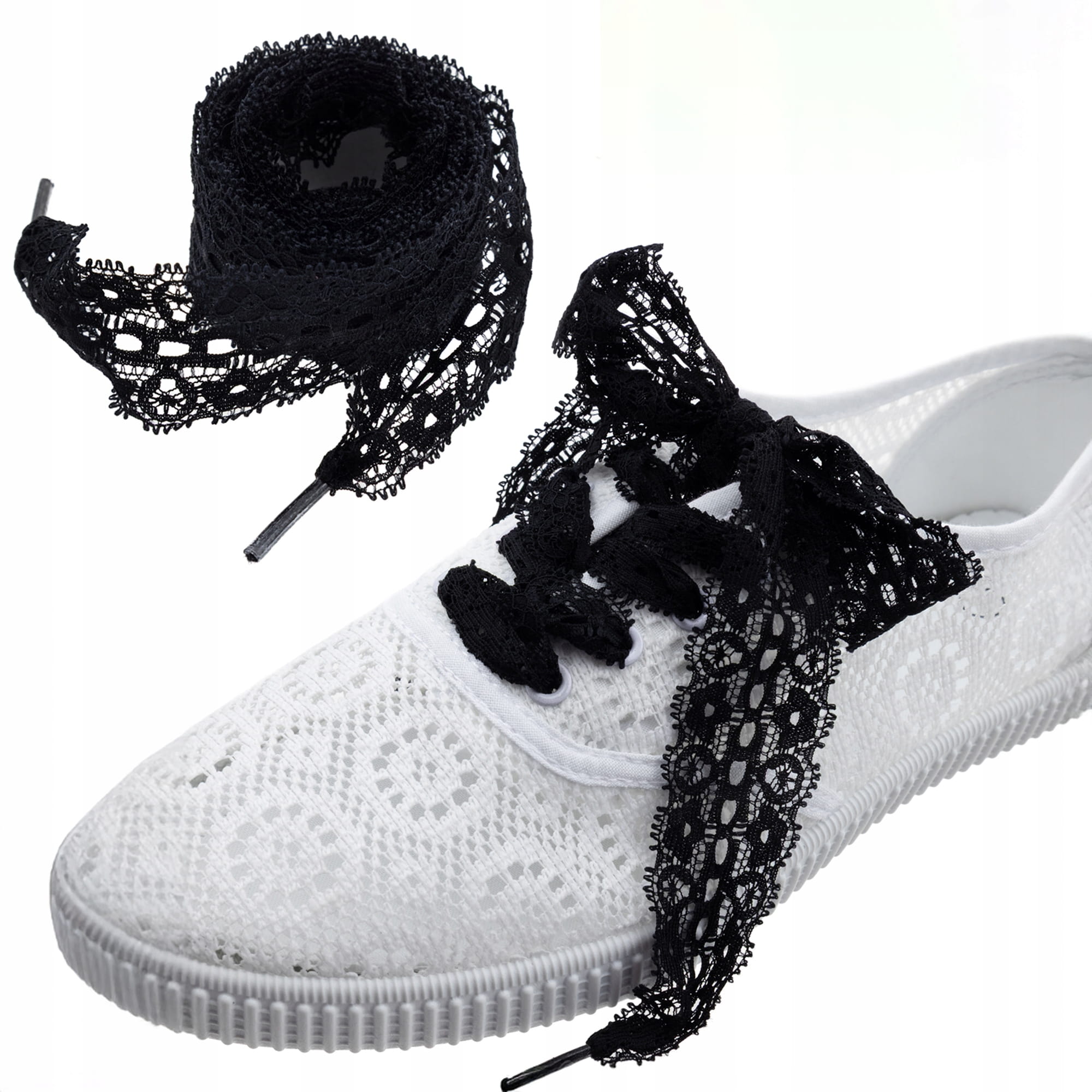 Eleganckie, czarne sznurówki z delikatnej koronki to świetny sposób, by odmienić każdy rodzaj obuwia – od klasycznych trampek po baleriny i espadryle. Dzięki nim nadasz swojej stylizacji nutkę romantyzmu, retro klimatu lub po prostu... więcej charakteru!