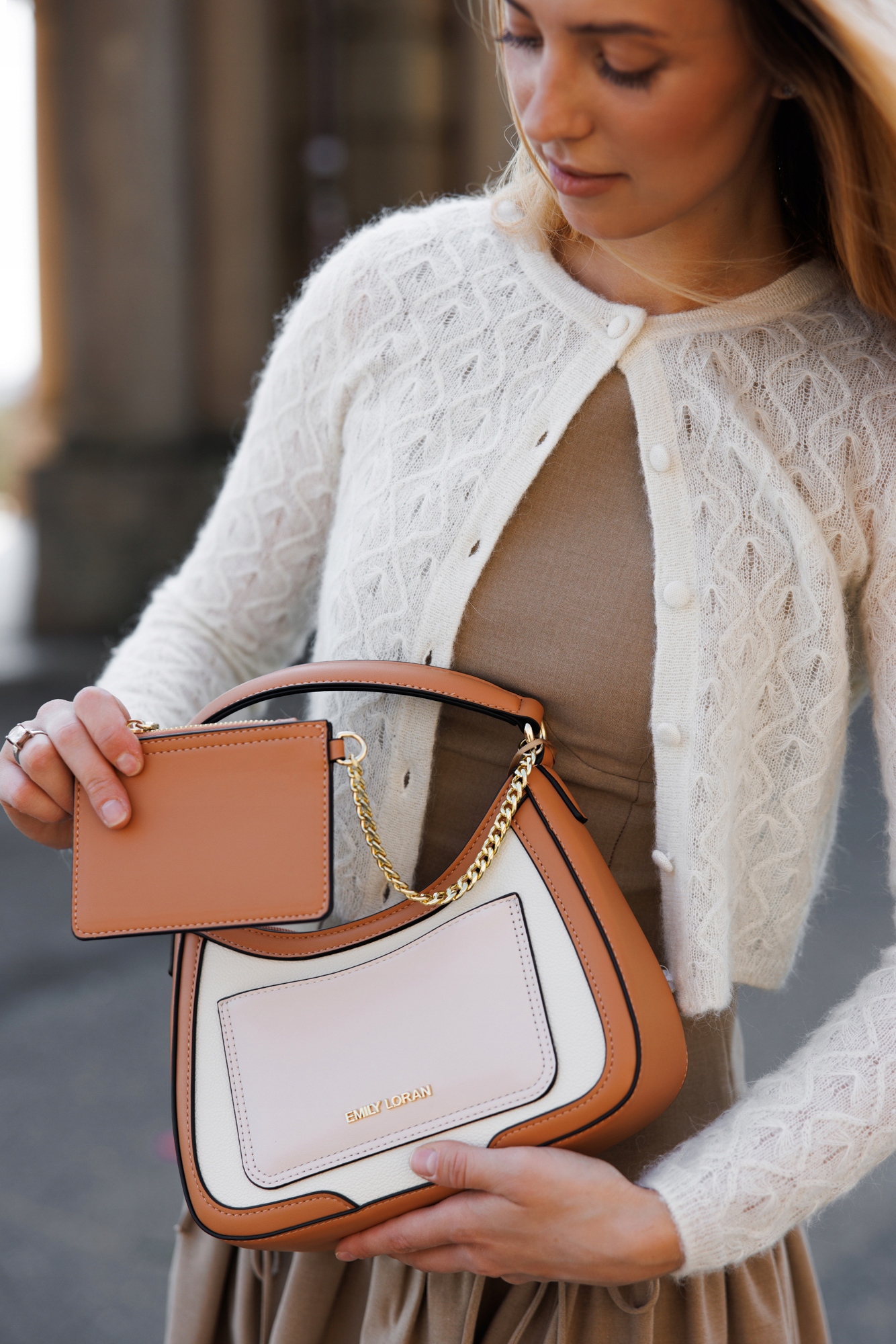 Podkreśl swój styl z elegancką torebką z kolekcji EMILY LORAN od Little Angel w ponadczasowym zestawieniu kolorów beżu i karmelu. To model, który łączy klasyczną formę z nowoczesnymi detalami – złoty łańcuszek, portmonetka na łańcuszku oraz wyraziste przeszycia dodają jej charakteru i sprawiają, że świetnie sprawdzi się zarówno na co dzień, jak i podczas wyjątkowych okazji.