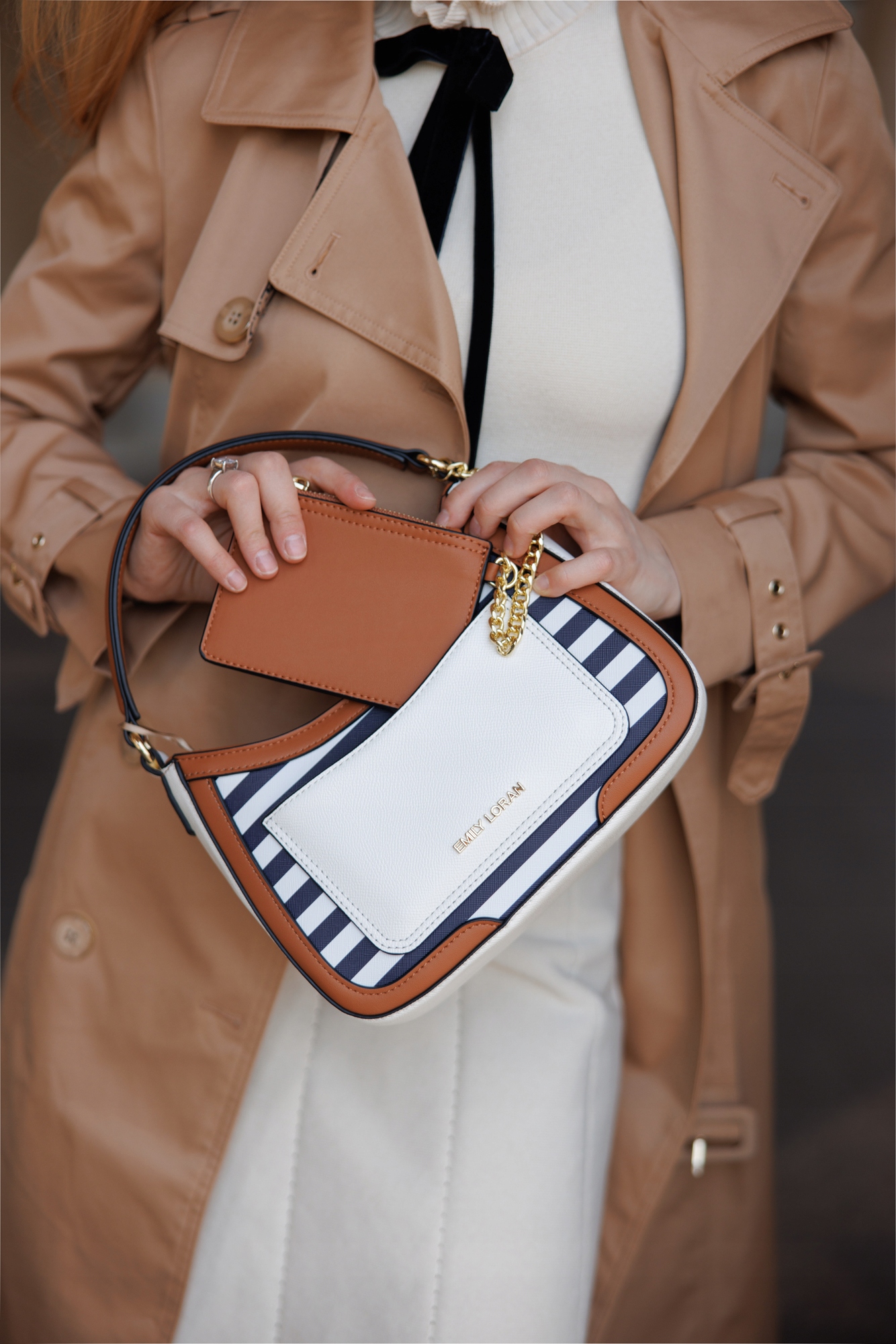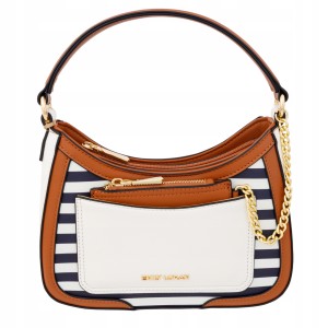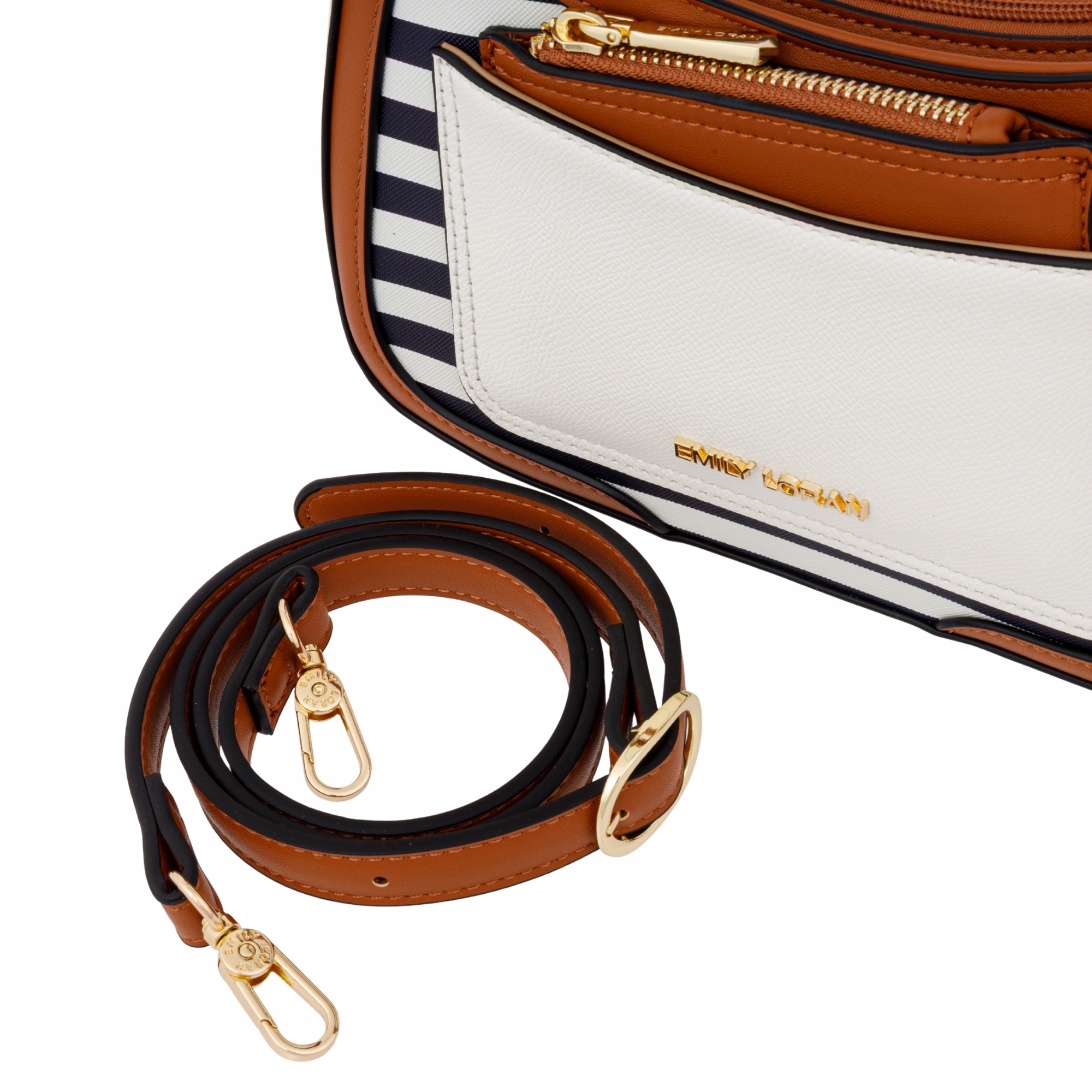 Torebka damska EMILY LORAN w paski biało-granatowe z brązowymi elementami