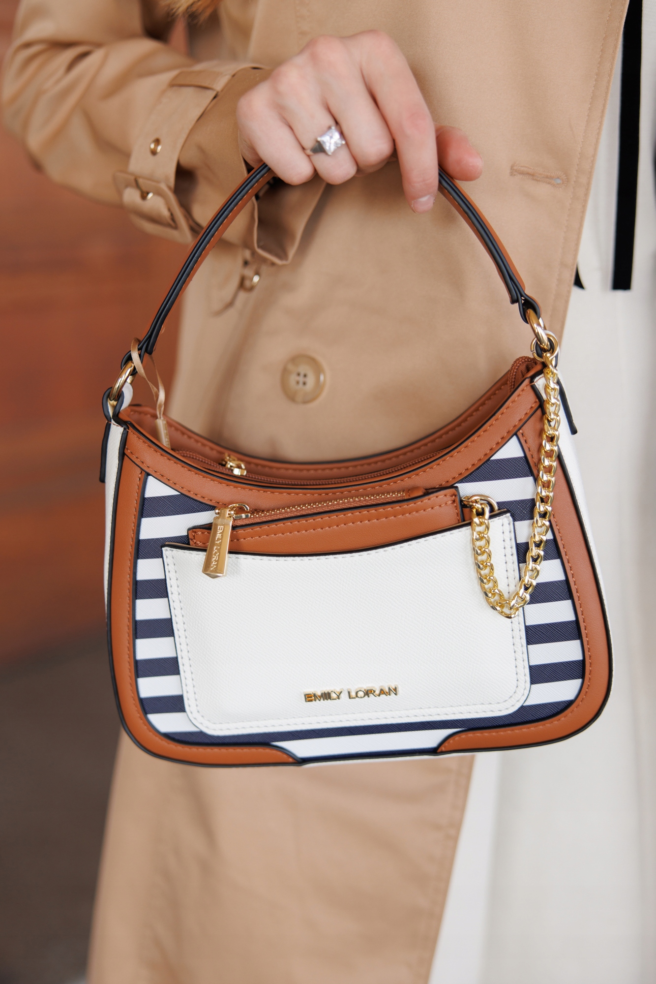 Torebka damska kolekcji EMILY LORAN w paski biało-granatowe z brązowymi elementami i złotym łańcuszkiem