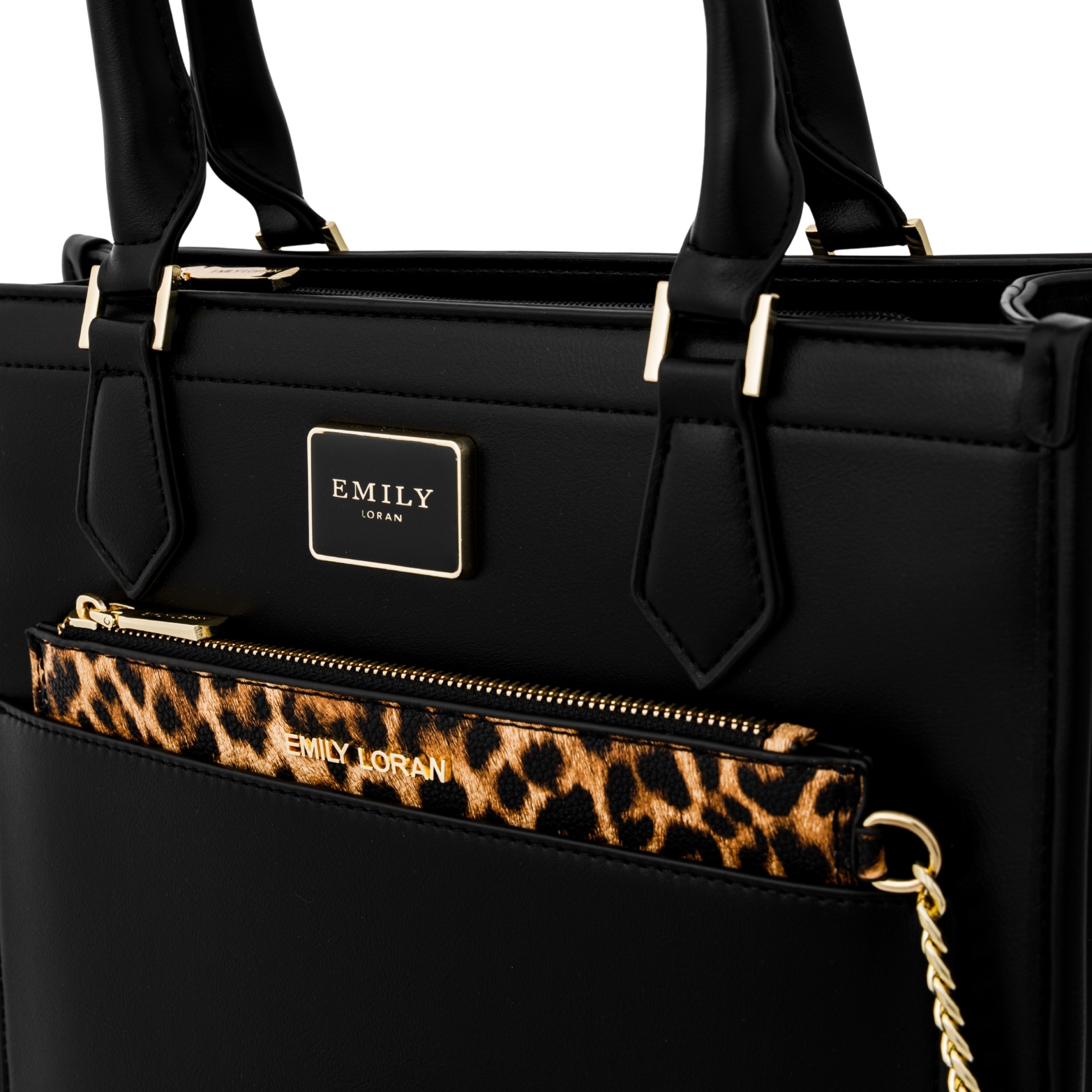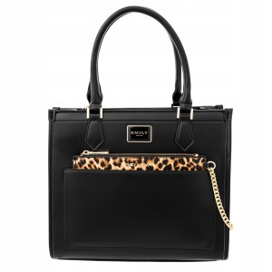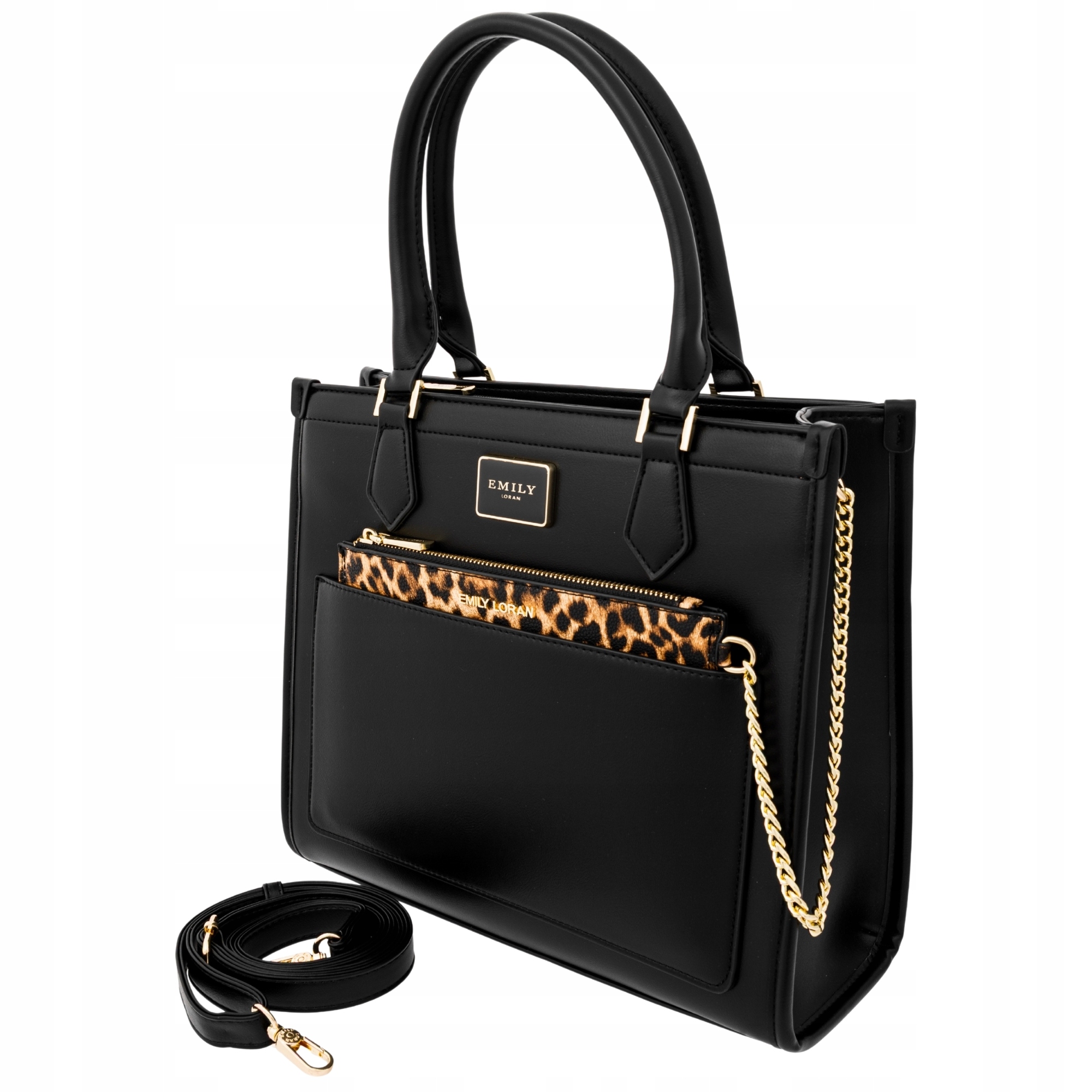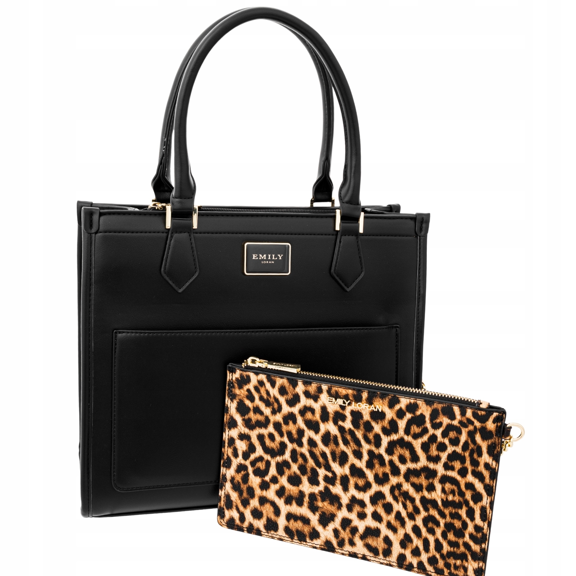 Klasyka w nowoczesnym wydaniu — czarna torebka EMILY LORAN z odpinaną kosmetyczką w modny wzór panterki to must-have każdej kobiety z klasą.