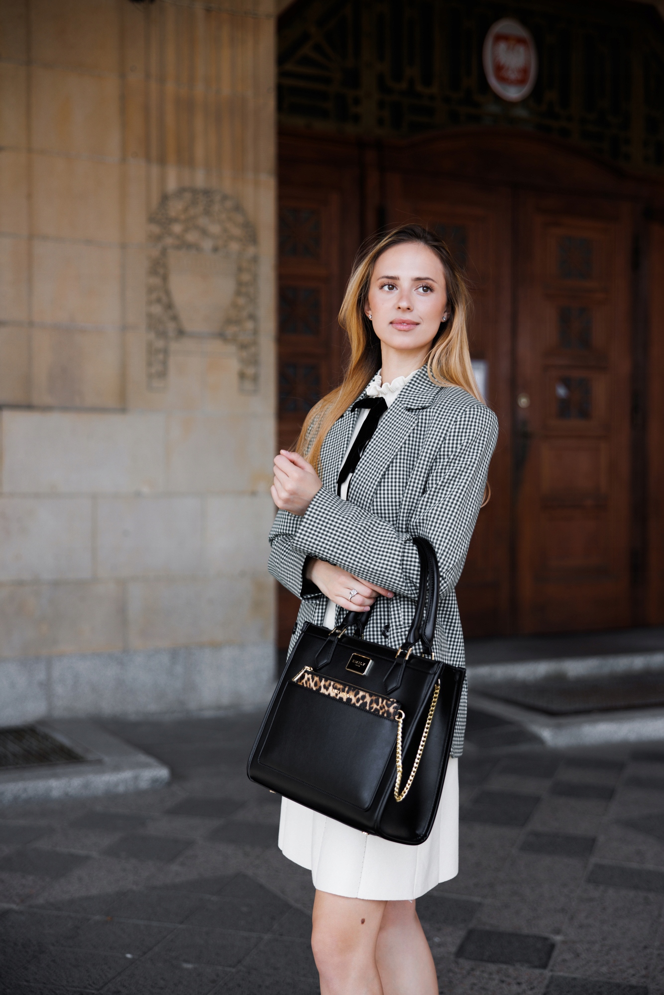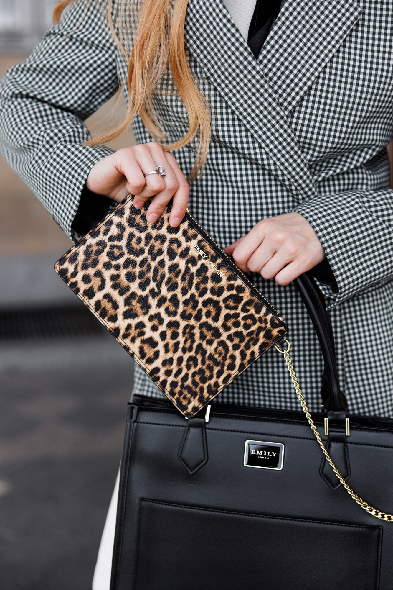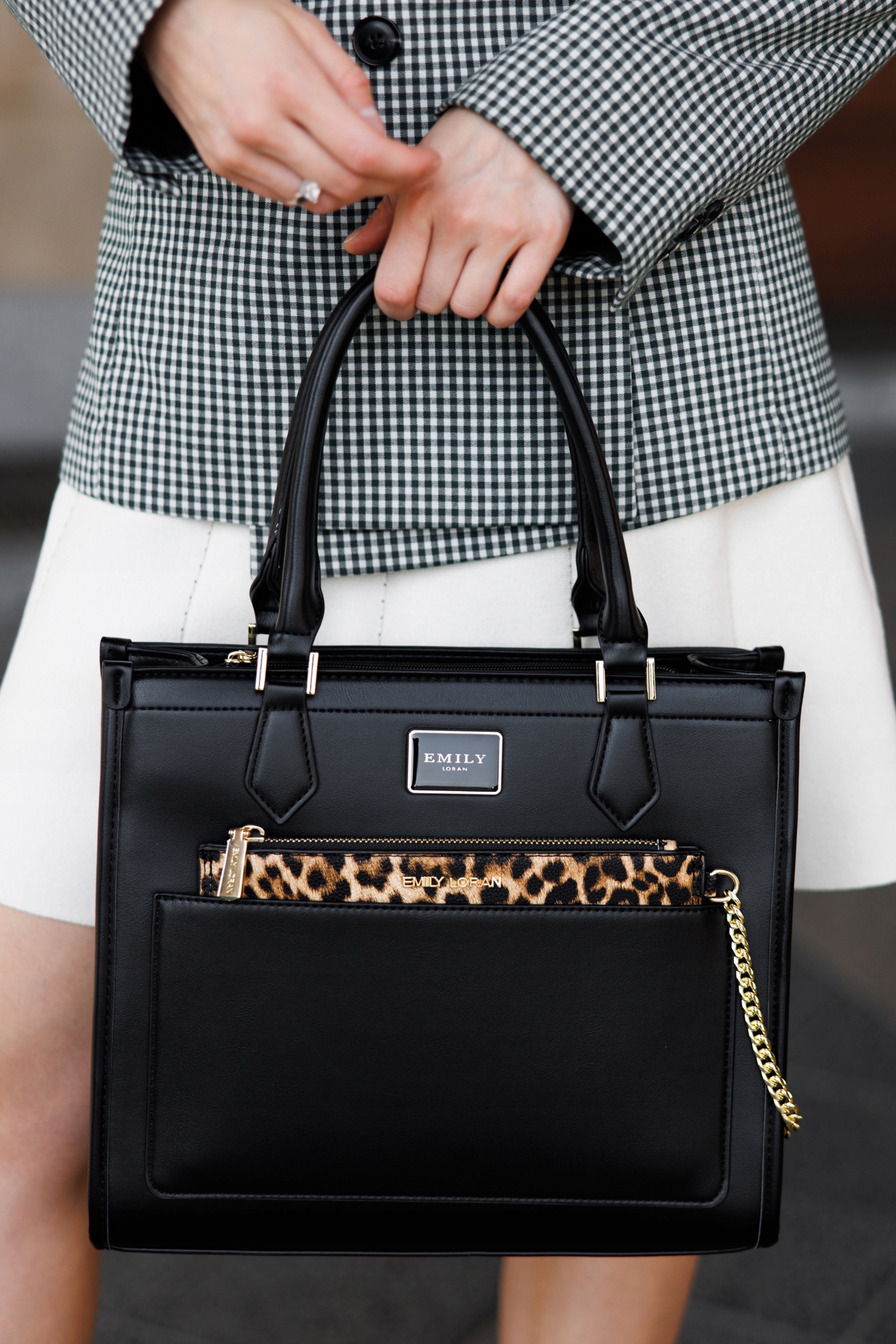 Klasyka w nowoczesnym wydaniu — czarna torebka EMILY LORAN z odpinaną kosmetyczką w modny wzór panterki to must-have każdej kobiety z klasą.
