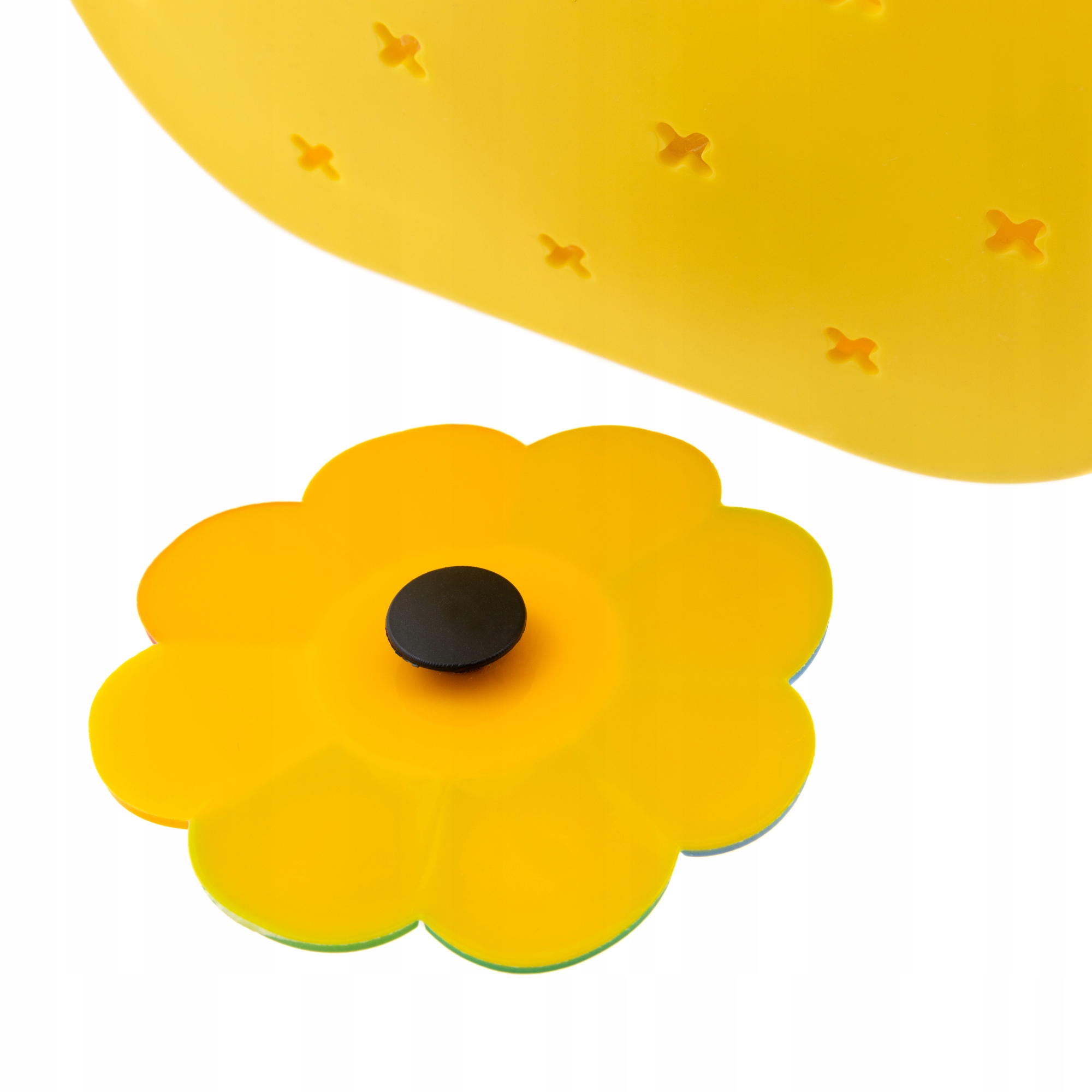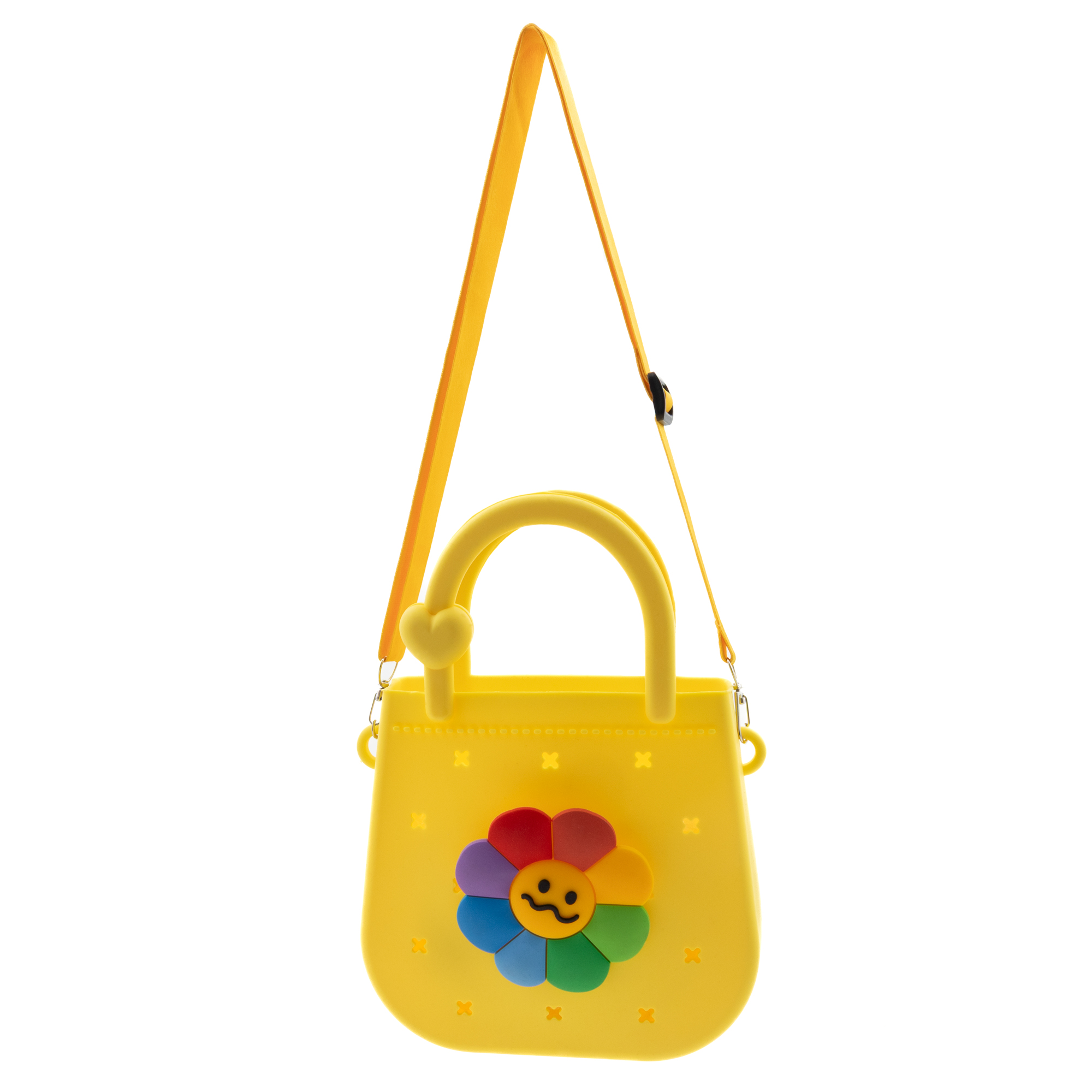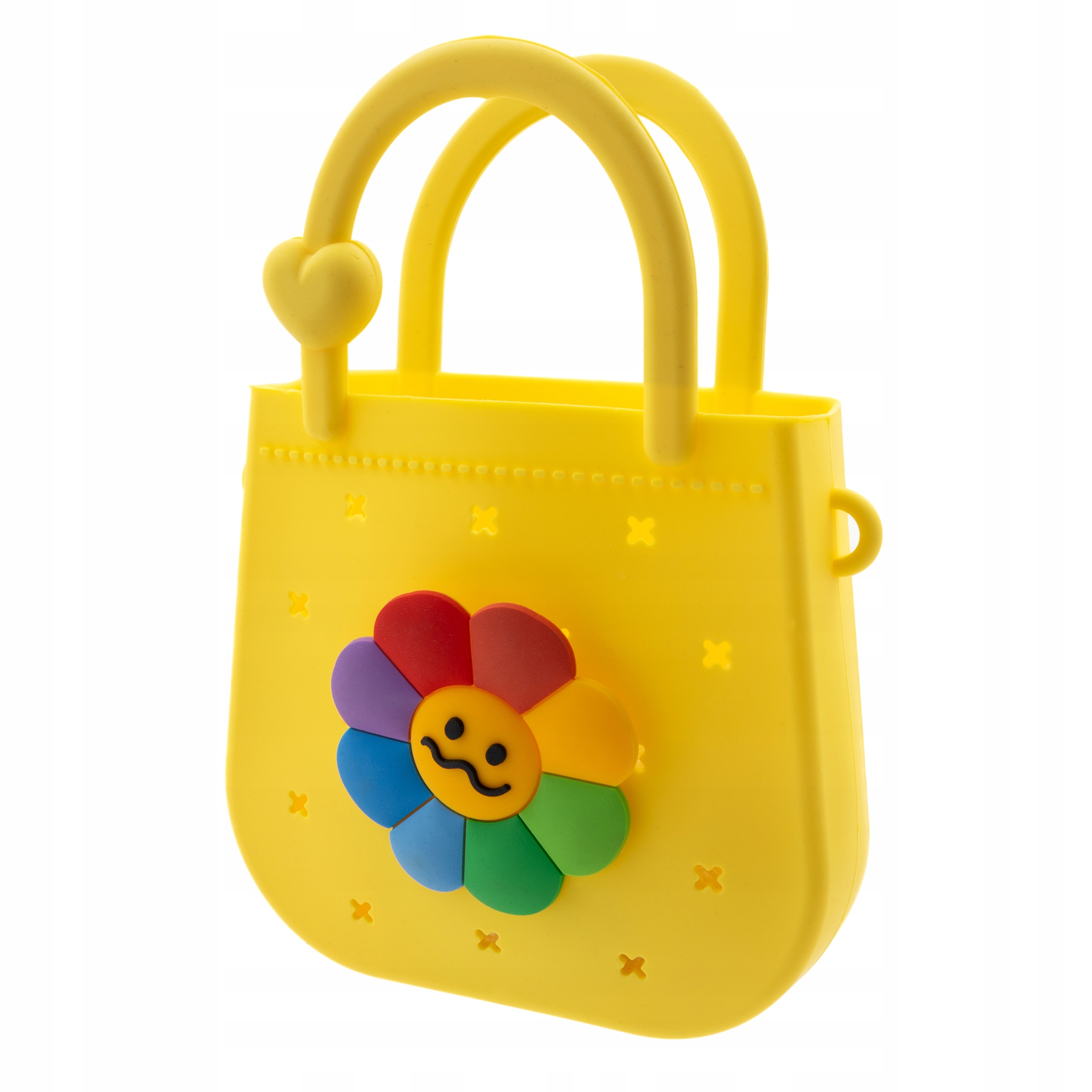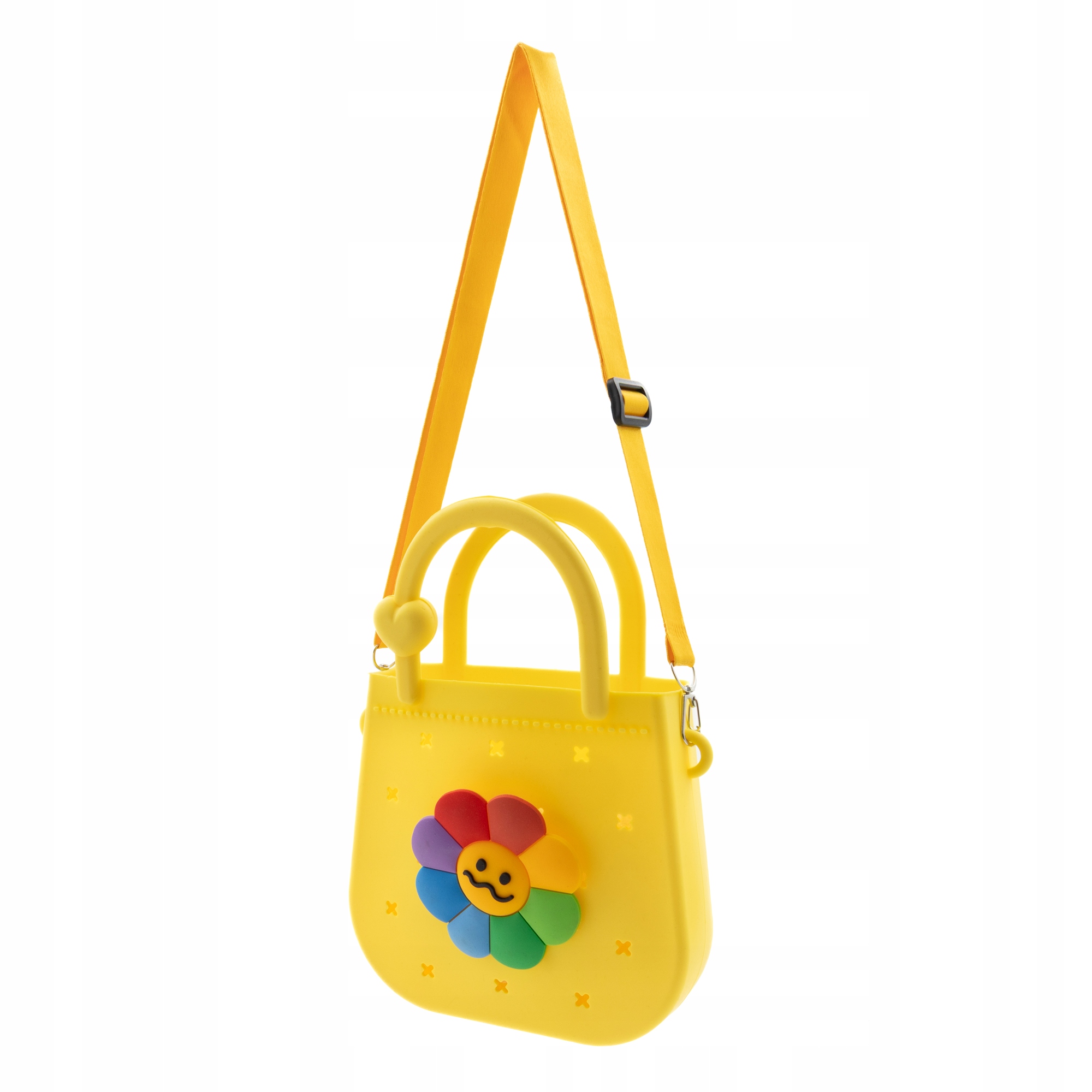 Wesoła, lekka i praktyczna torebka dla dziewczynki, wykonana z wysokiej jakości silikonu. Żółty kolor w połączeniu z uroczym, odpinanym kwiatkiem (na zatrzask) sprawia, że to idealny dodatek na spacer, zakupy czy do przedszkola.
