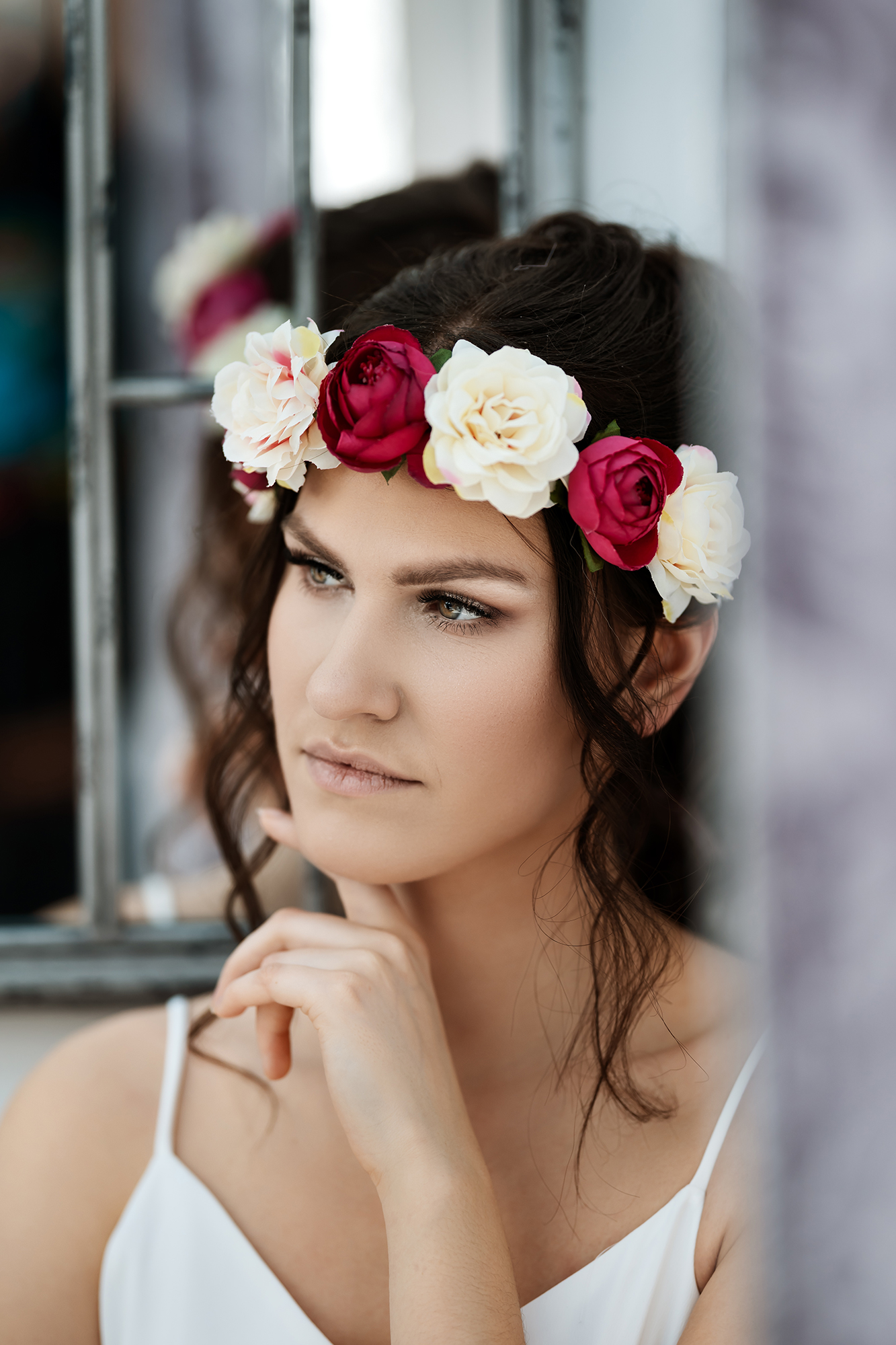 Materiał: drucik owinięty brązową celulozą, kwiatki i listki z tkaniny poliestrowej, środki kwiatków plastikowe