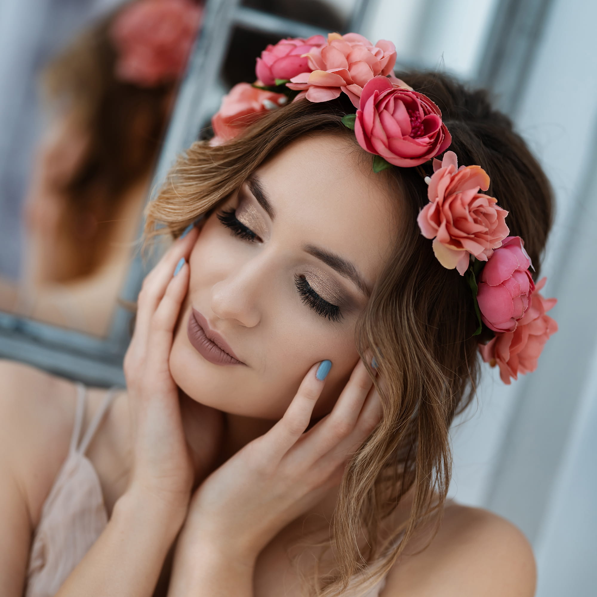 Romantyczny różowy wianek z dużymi kwiatami i zielonymi listkami.