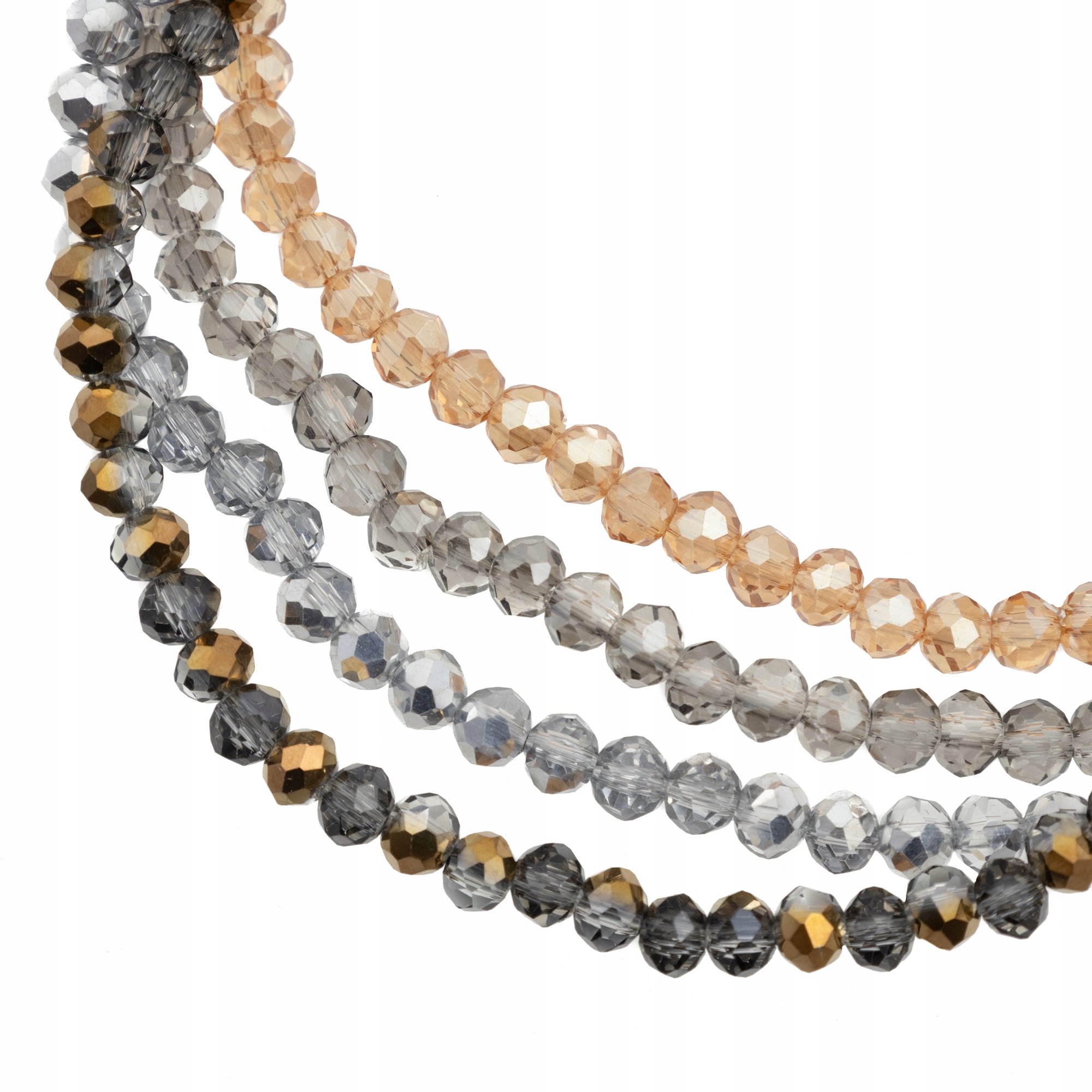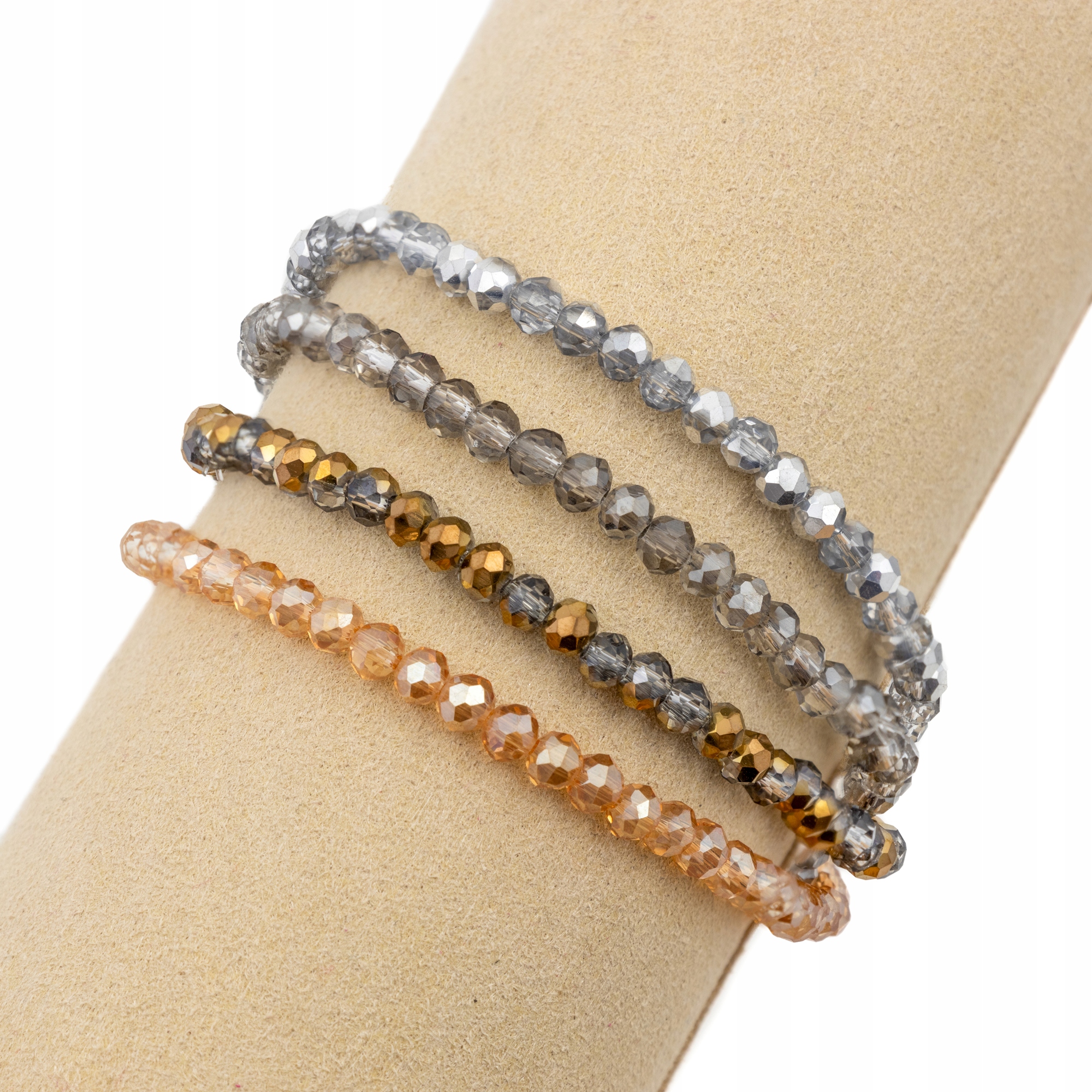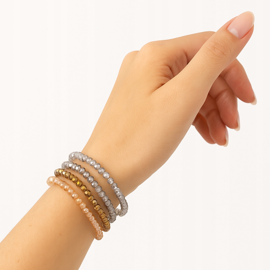 Stylowa i elegancka biżuteria, która doda blasku każdej stylizacji! Zestaw czterech elastycznych bransoletek wykonanych z fasetowanych szklanych koralików w odcieniach szarości, złota i bursztynu to idealny wybór na co dzień i na specjalne okazje.