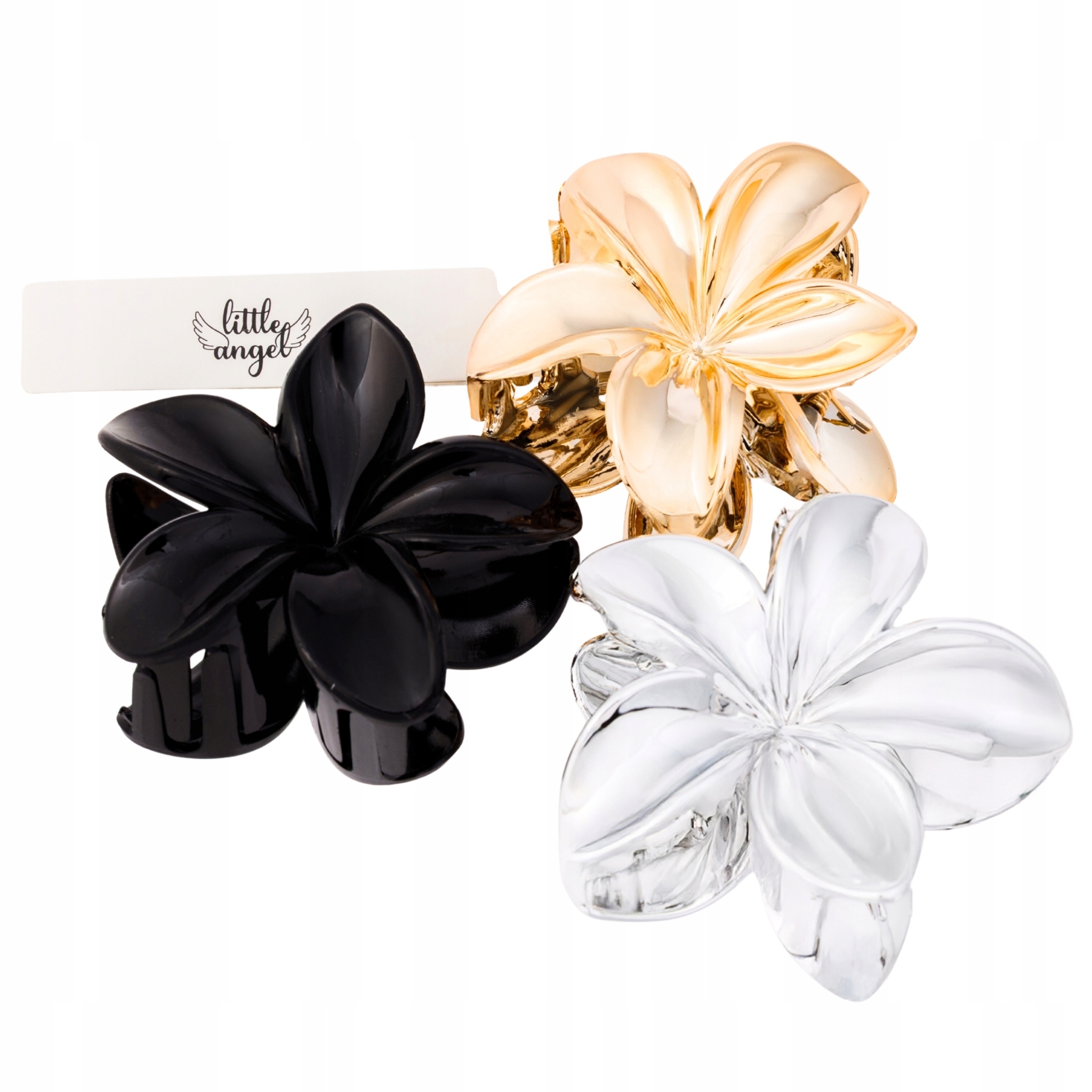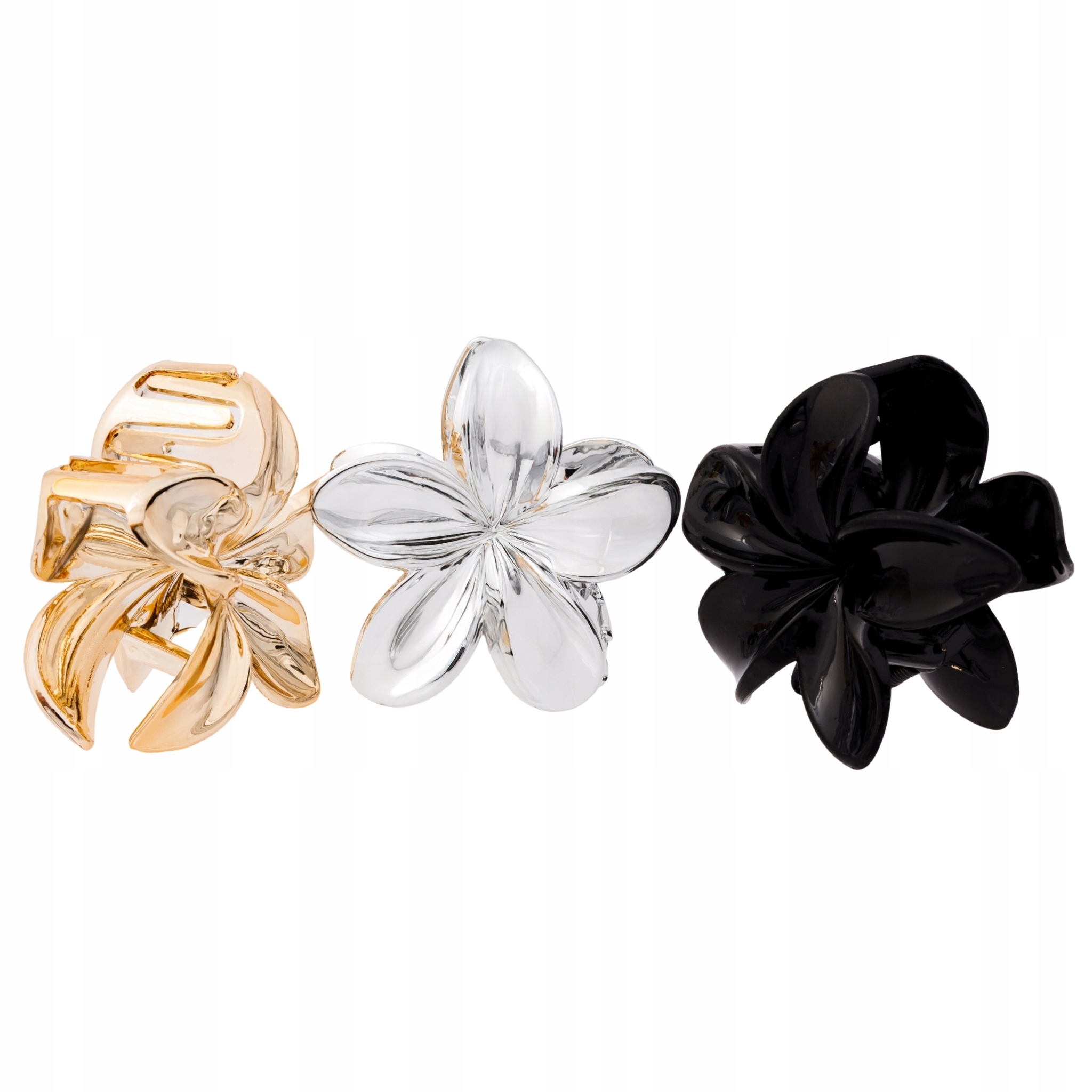 Zestaw 3 dużych spinek do włosów kwiat glamour – czarna, złota, srebrna