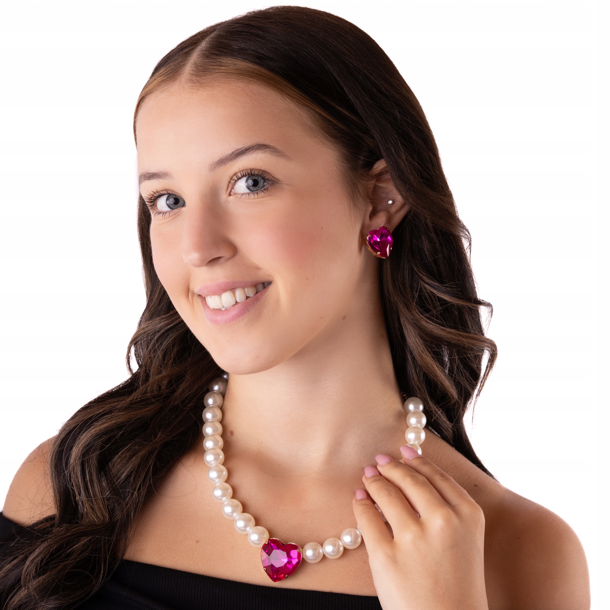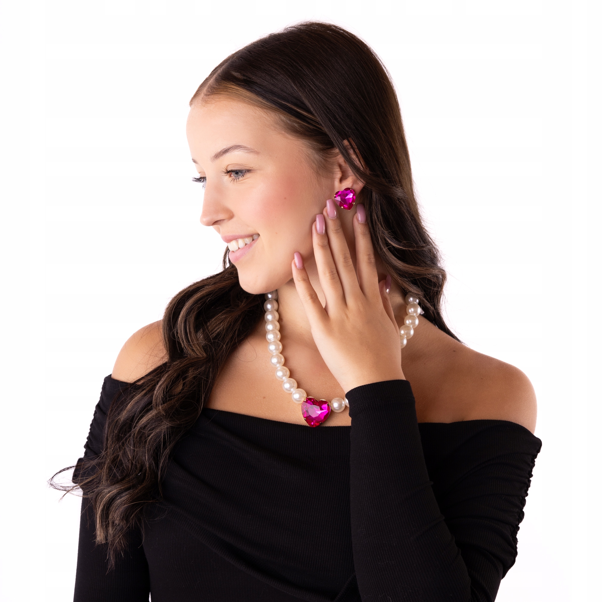 - Naszyjnik: Subtelne, lśniące perły ozdobione dużym różowym kryształem w kształcie serca, który stanowi centralny punkt kompozycji. Naszyjnik jest regulowany dzięki dodatkowej przedłużce.
