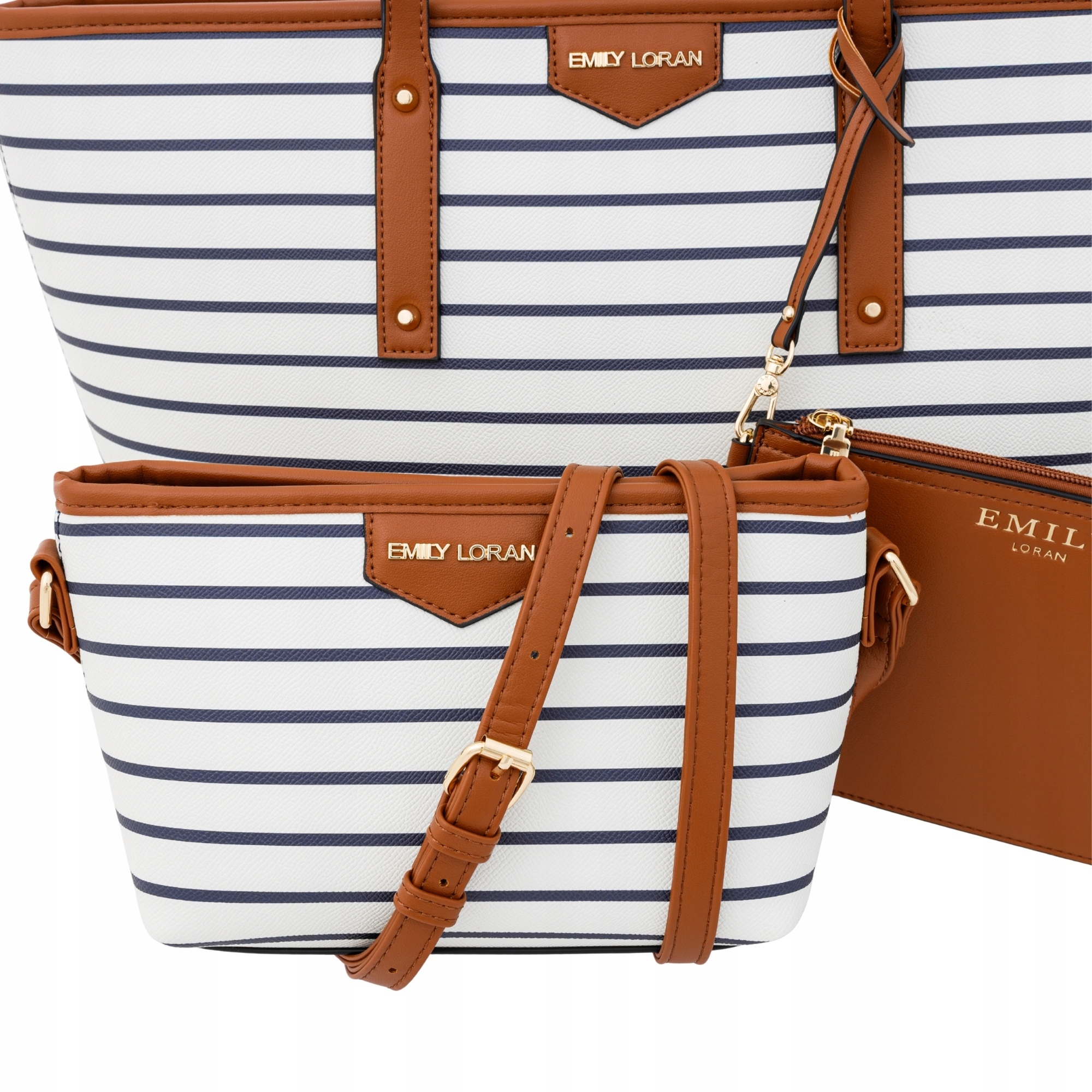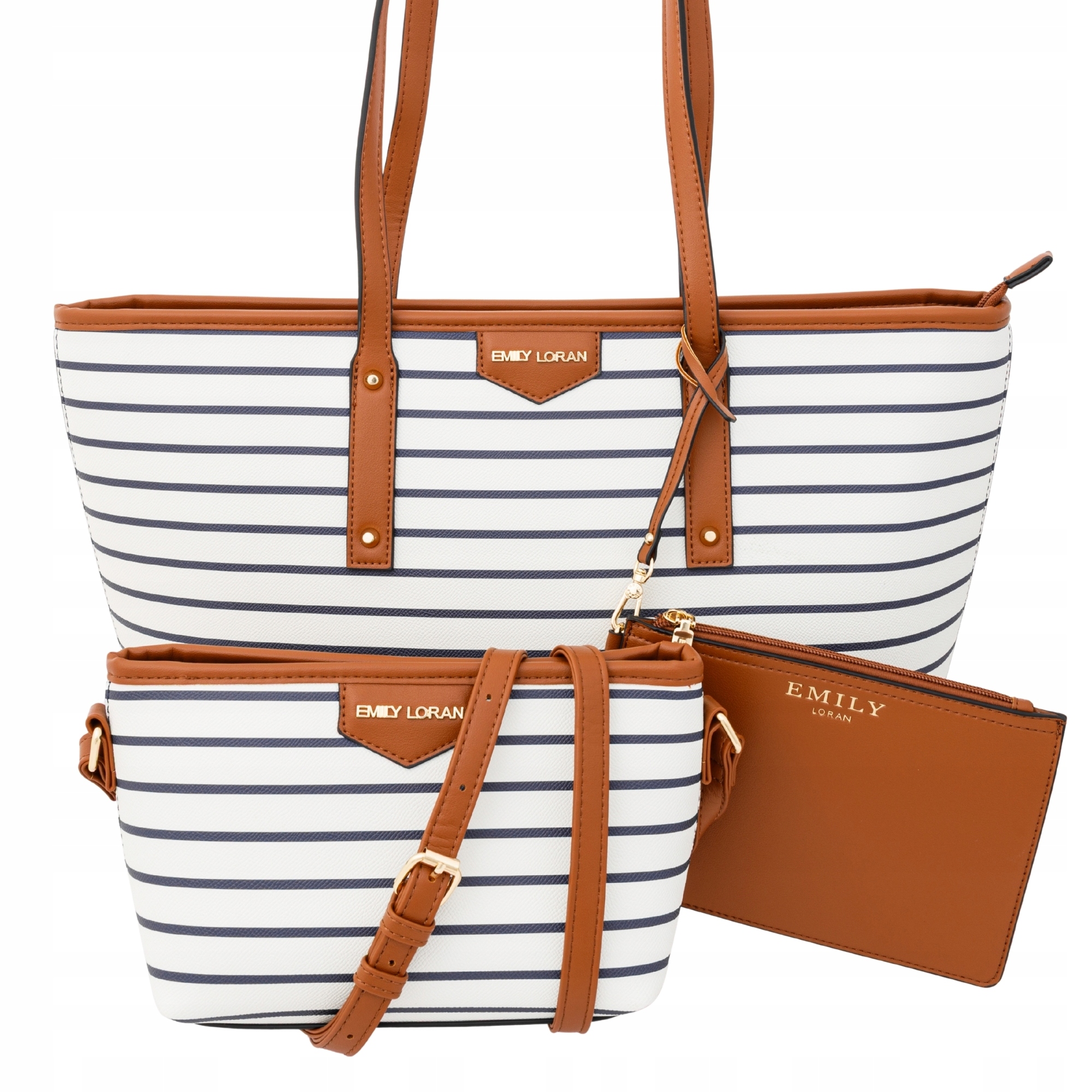 Zestaw Toreb Emily Loran w Paski Granatowe – Shopper, Torebka na Ramię i Kopertówka 3w1