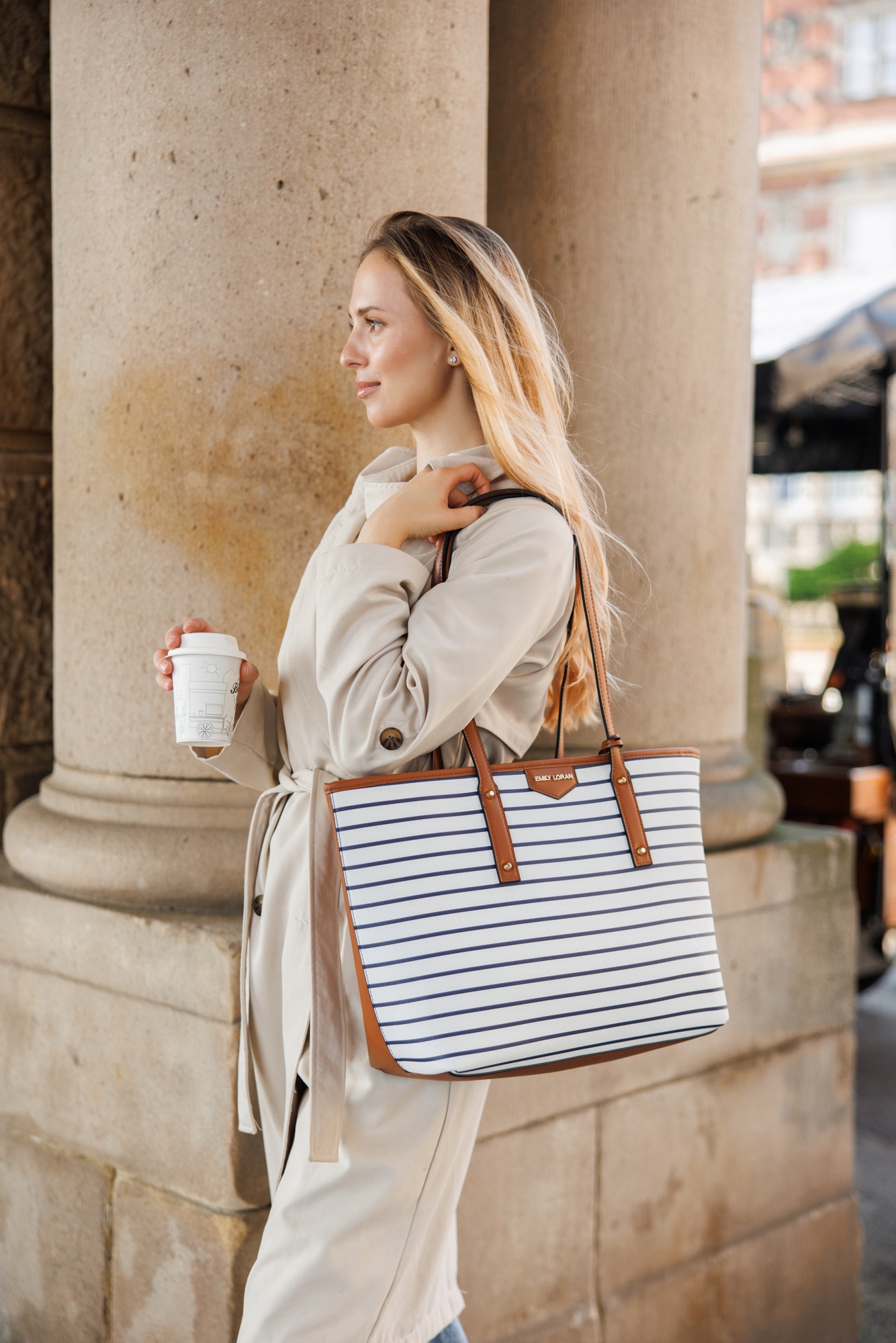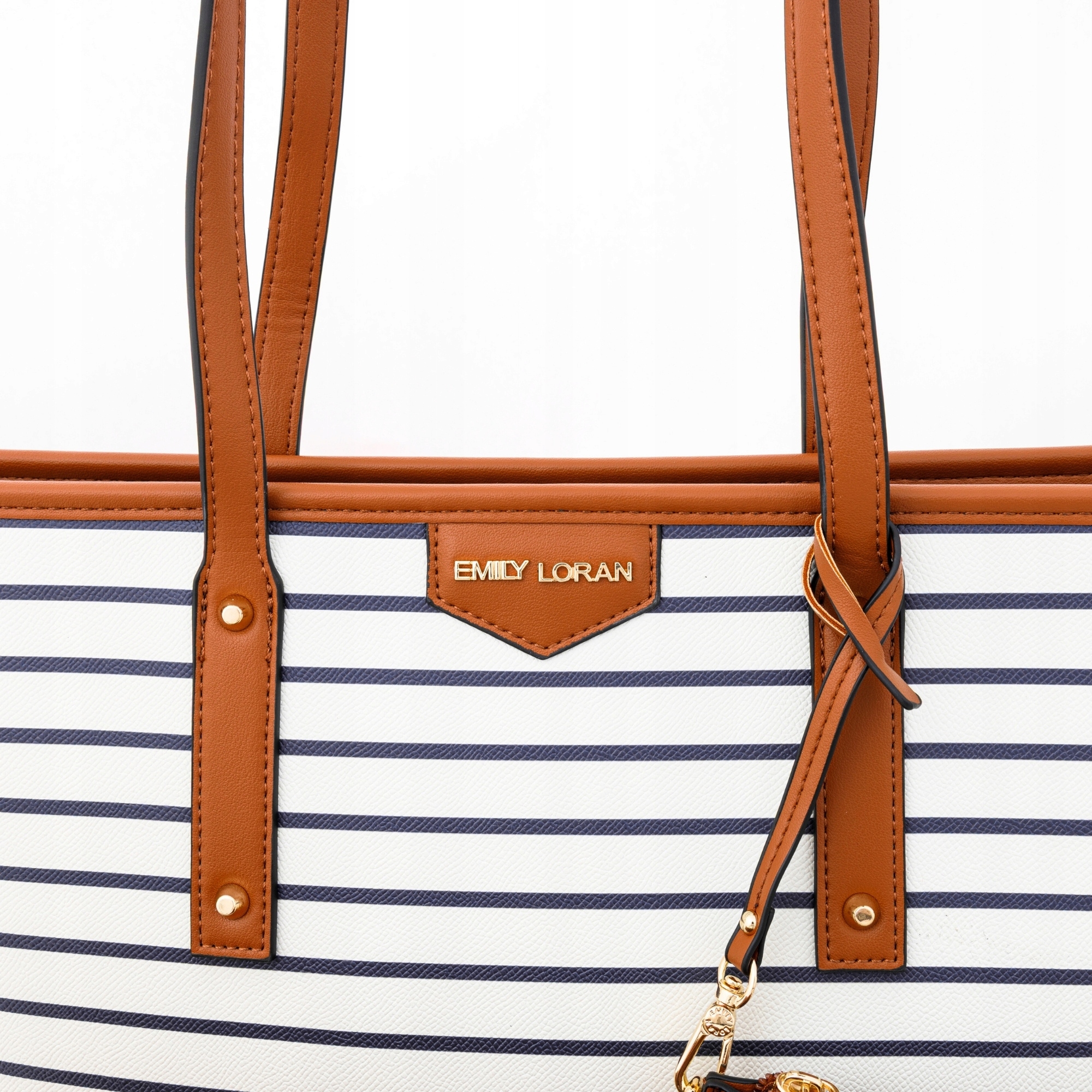 Granatowe paski i karmelowe detale sprawiają, że torby mają lekki, świeży i ponadczasowy charakter. Będą pasować zarówno do eleganckiego trencza, jak i jeansów z t-shirtem.