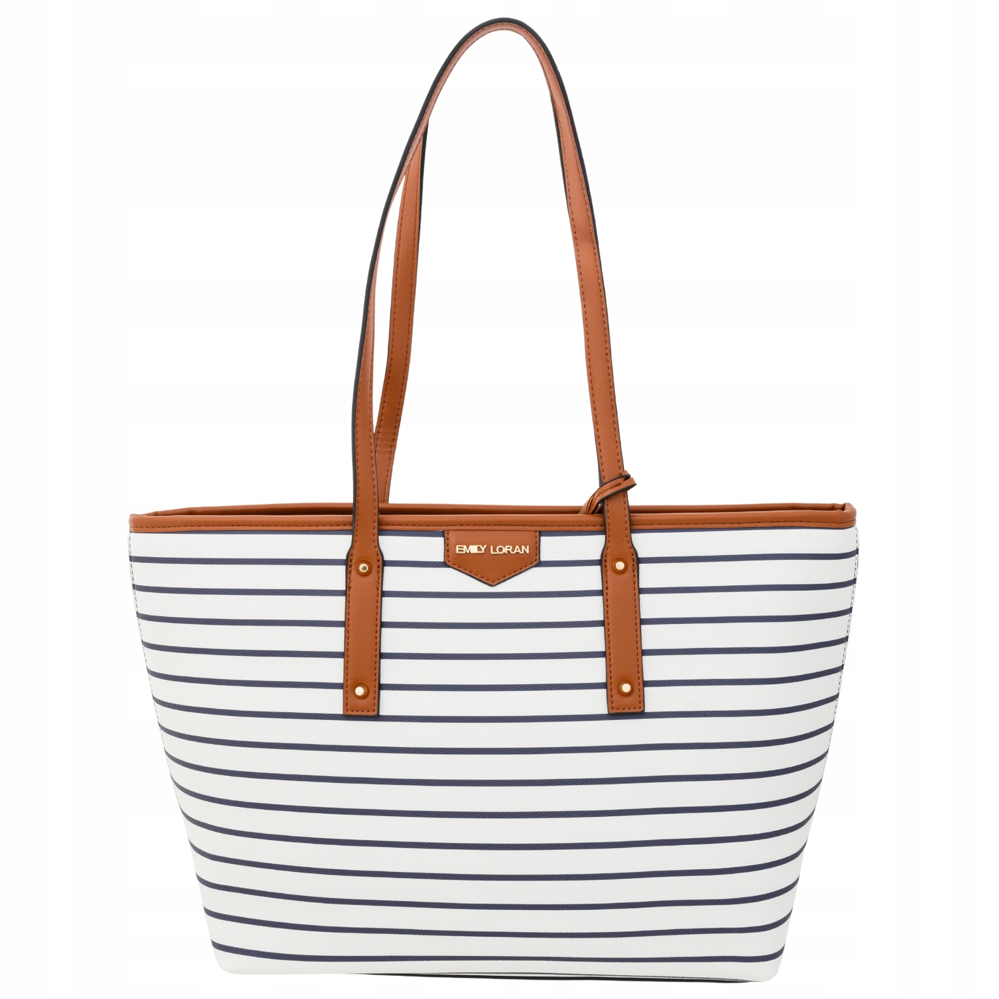 - Dużą shopperkę – pojemna torba z długimi uchwytami, w której zmieścisz laptop, dokumenty, zakupy lub rzeczy na cały dzień. Wyróżnia się modnym wzorem w biało-granatowe paski, uzupełnionym karmelowymi elementami. Idealna na uczelnię, do pracy czy na wyjazd.