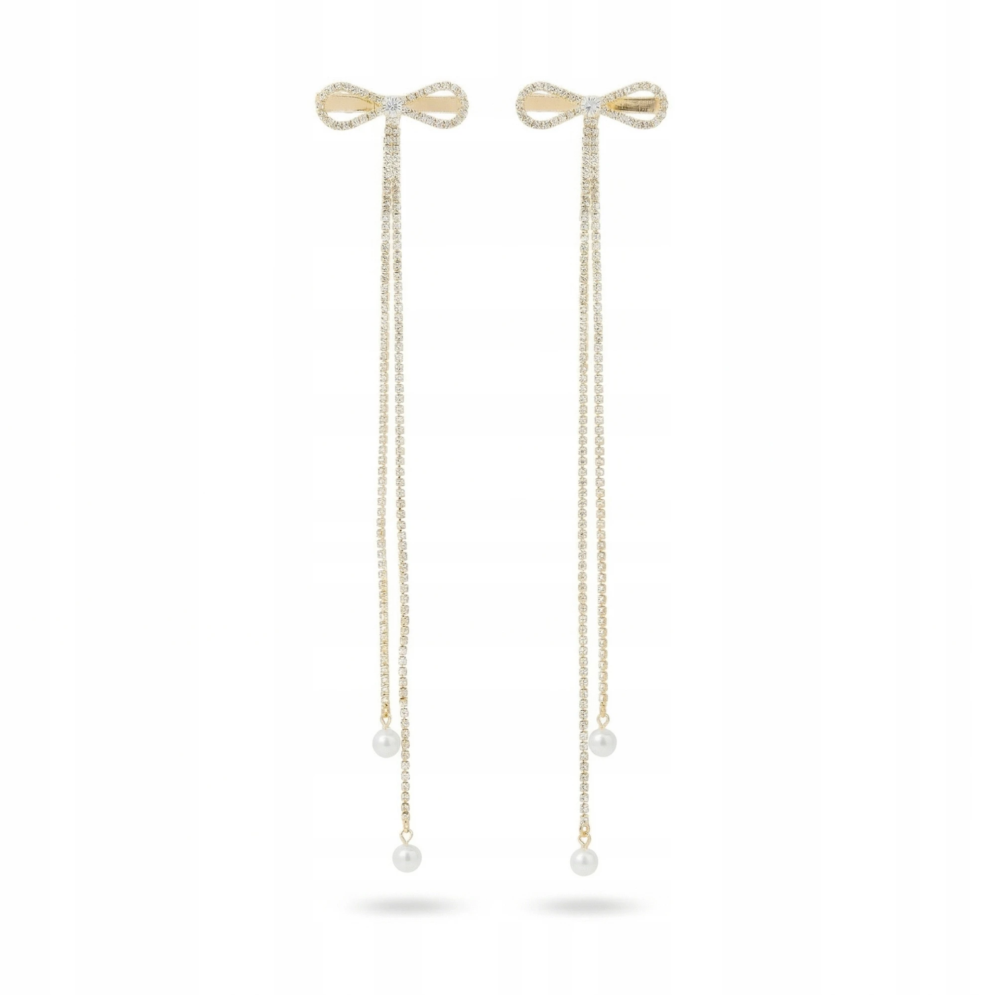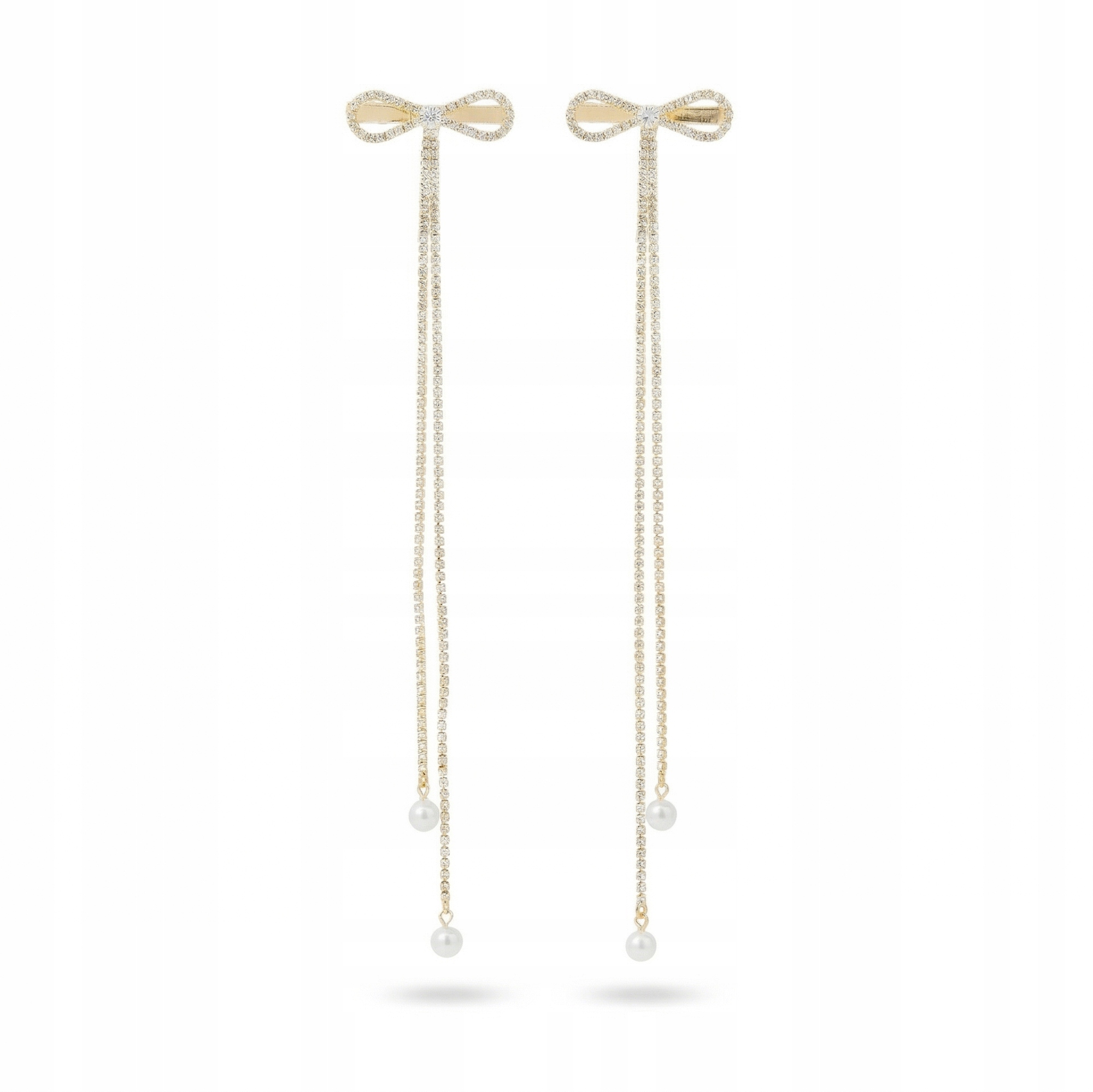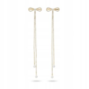 Złote kokardki z długimi, zdobionymi łańcuszkami optycznie wydłużają fryzurę i dodają jej lekkości. Perełki nadają całości romantycznego wykończenia, a kryształki pięknie odbijają światło.