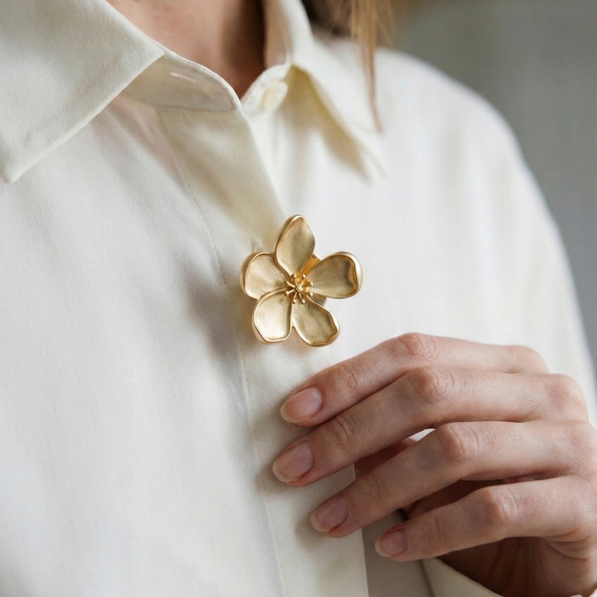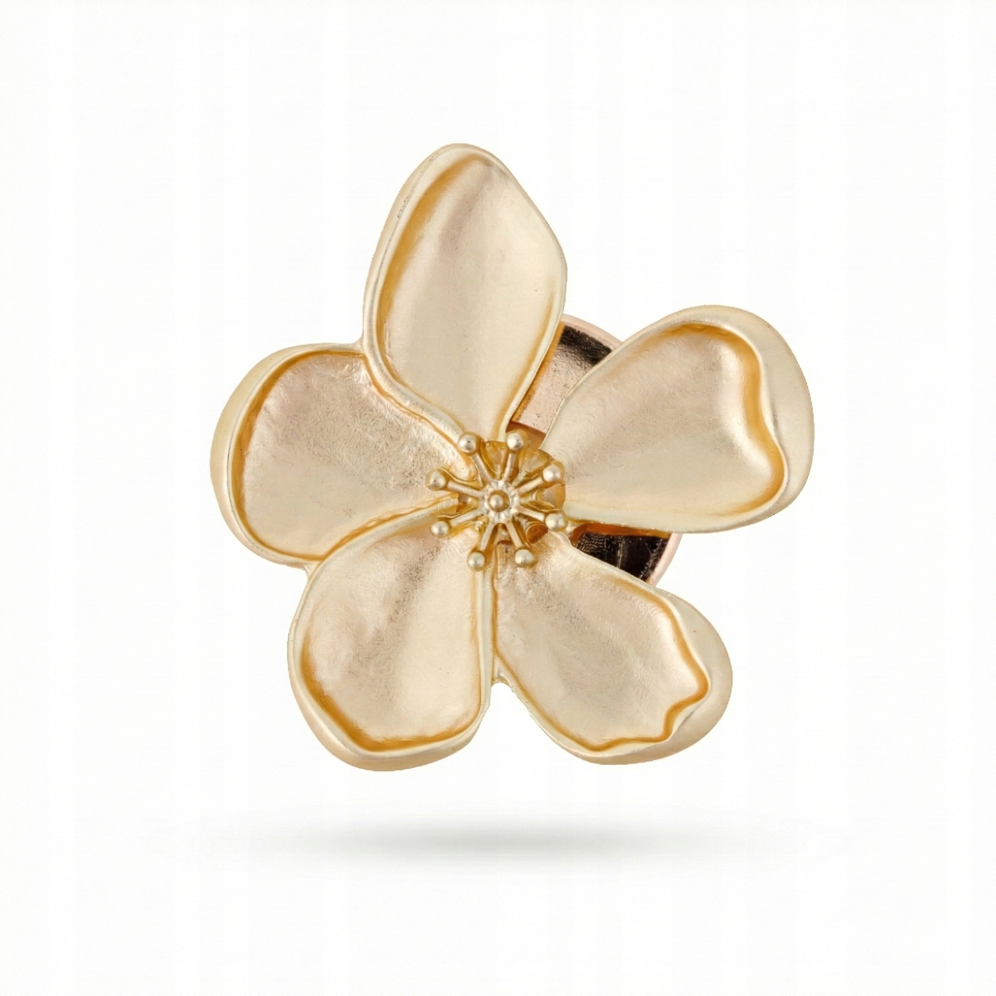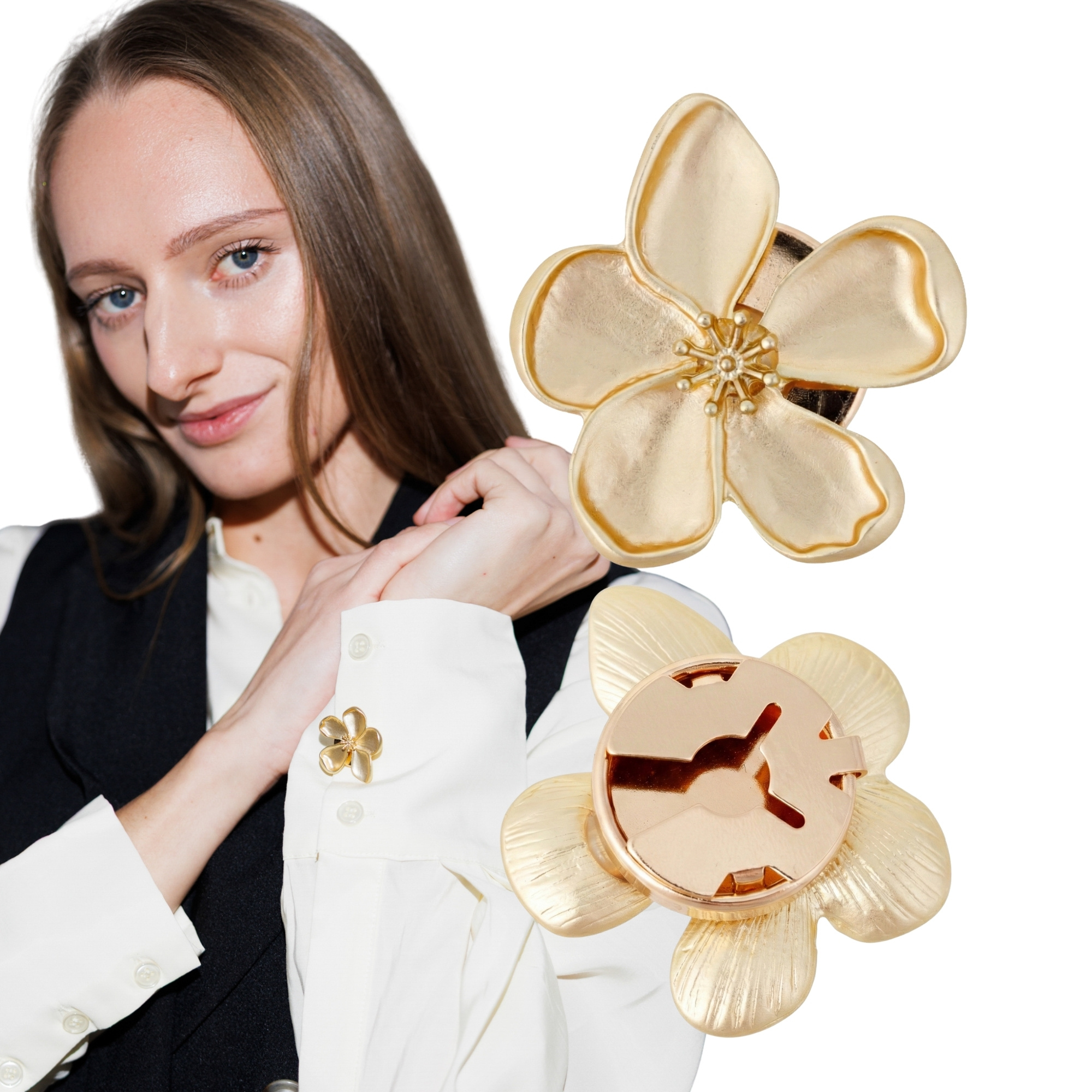 Subtelny detal, który zmienia całą stylizację. Ta złota nakładka na guzik w kształcie pięciopłatkowego kwiatu to biżuteryjne wykończenie koszuli, marynarki lub bluzki. Delikatnie satynowana powierzchnia płatków pięknie odbija światło, nadając całości luksusowy, ale nienachalny charakter.