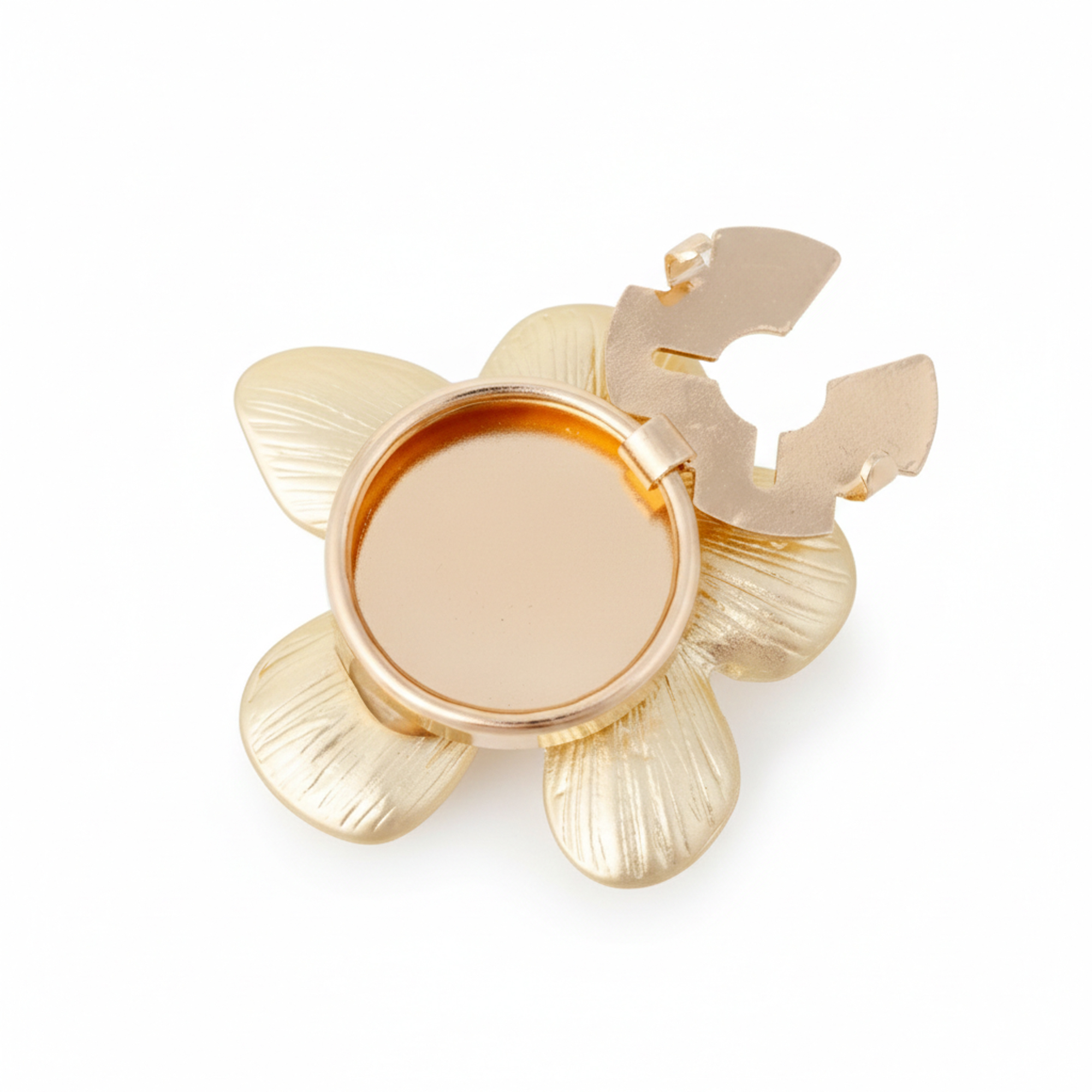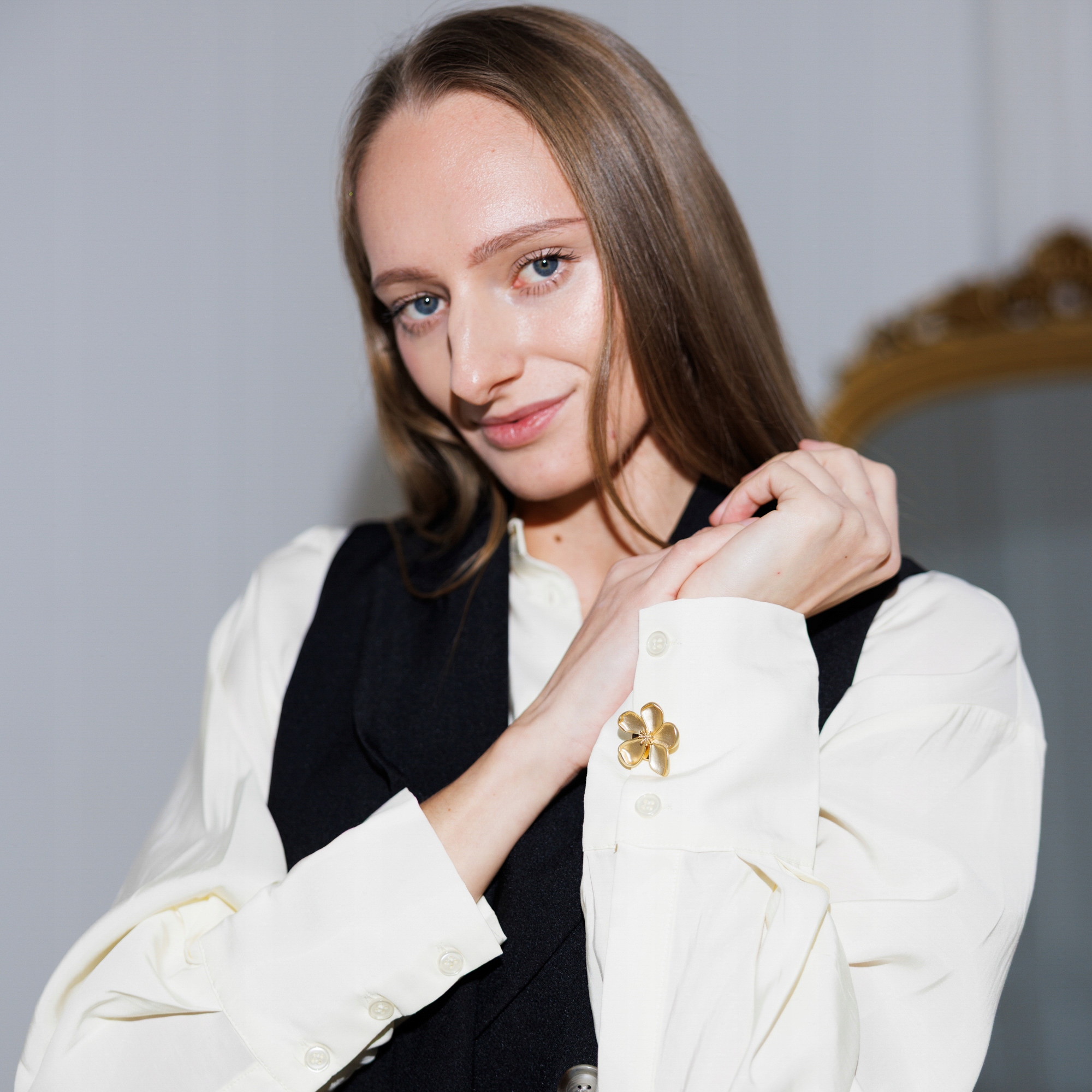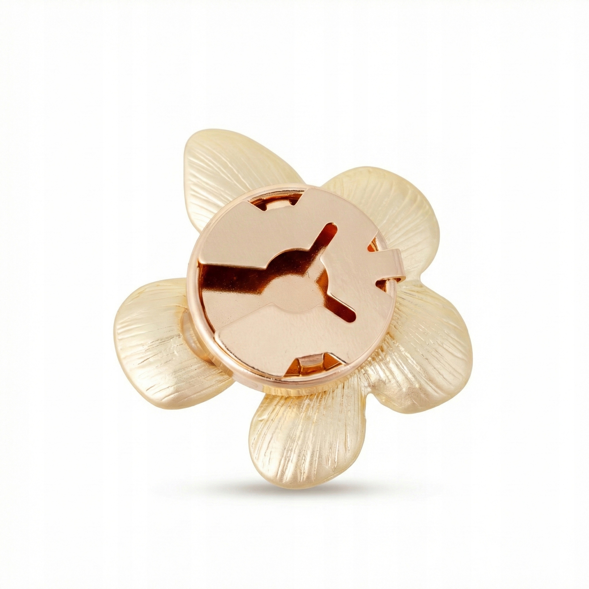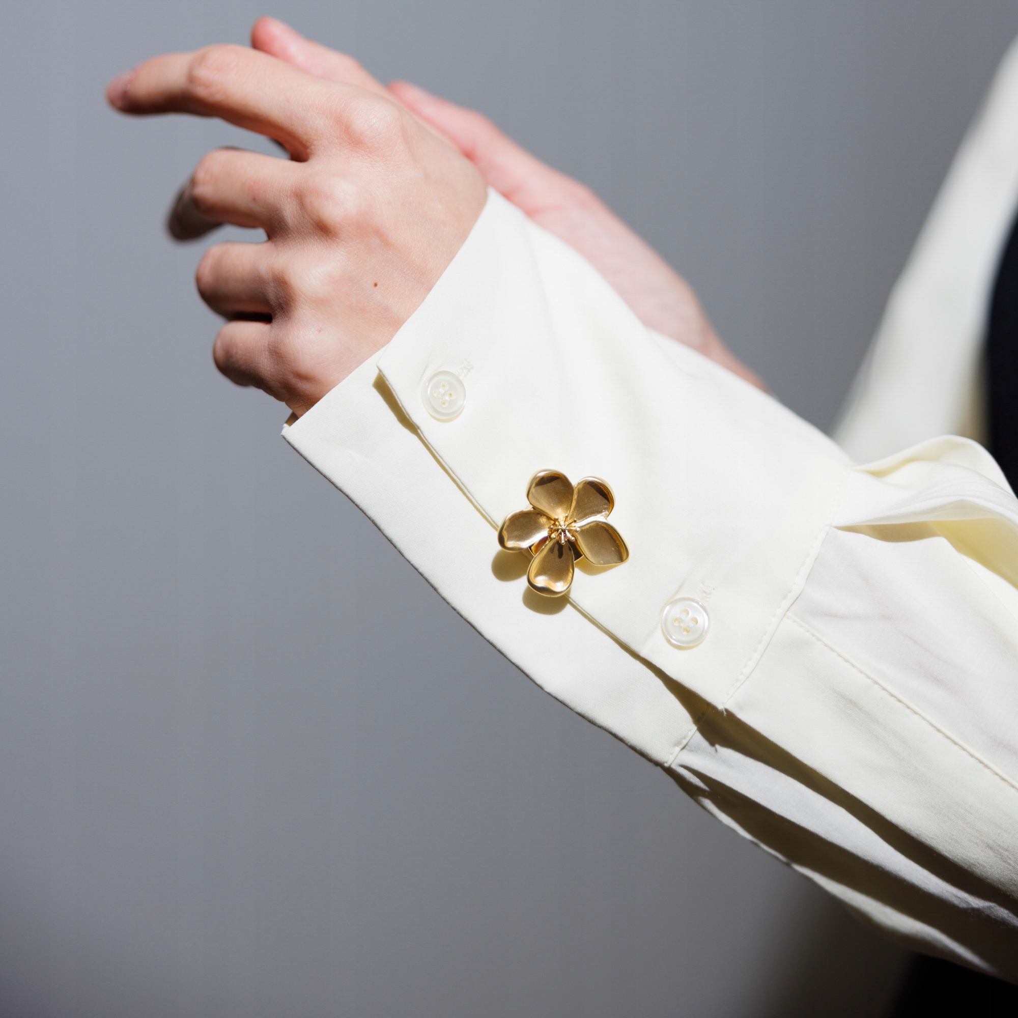 Subtelny detal, który zmienia całą stylizację. Ta złota nakładka na guzik w kształcie pięciopłatkowego kwiatu to biżuteryjne wykończenie koszuli, marynarki lub bluzki. Delikatnie satynowana powierzchnia płatków pięknie odbija światło, nadając całości luksusowy, ale nienachalny charakter.